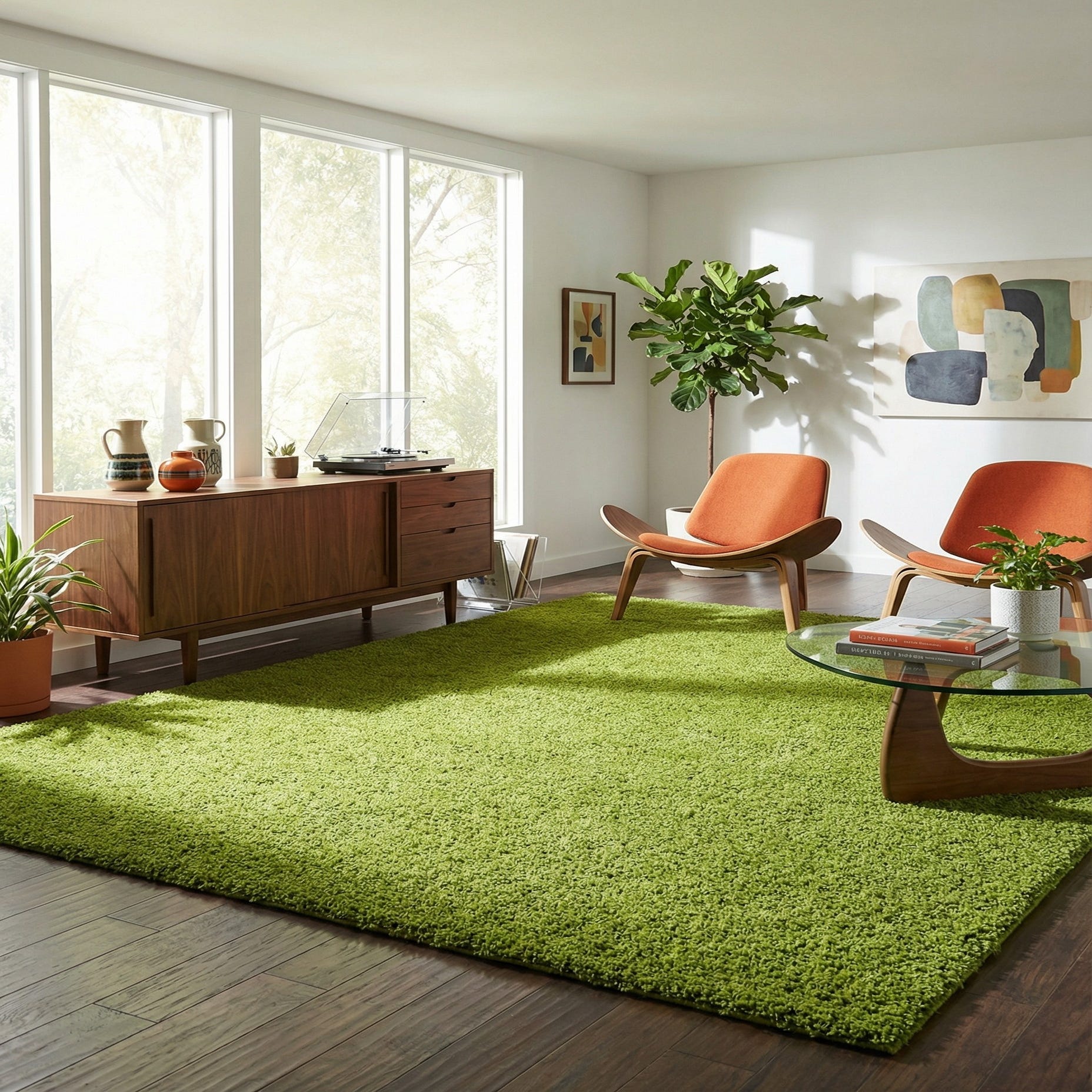 A solid field of grass green brings an energetic, contemporary touch while keeping the overall look clean and simple. The high-pile shag offers a deep, plush texture you can feel beneath your feet—dense, slightly springy tufts that soften hard floors and add visual depth without a patterned distraction. Machine-made from 100% polypropylene, the construction delivers consistent pile height and color across the surface.