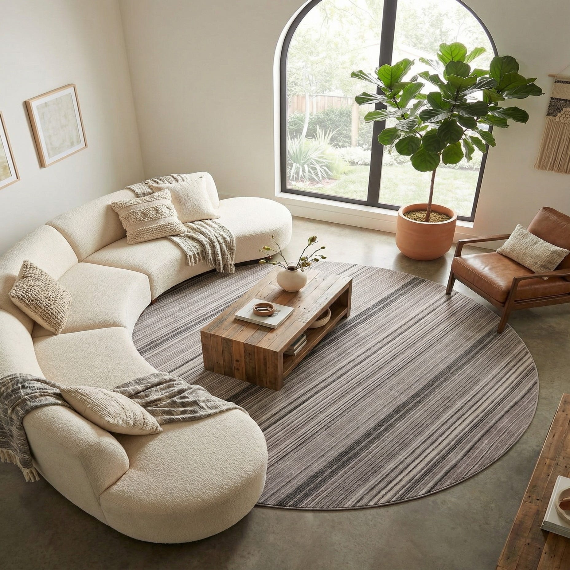 Machine-made from polypropylene, the rug has a low, dense pile that feels smooth and slightly cushioned underfoot. Its round shape makes it a natural choice under a dining table, as a seating-area anchor in a living room, or centered beneath a bedside vignette; it also works well in a home office or entry when you want clean lines and a neutral base. Pair it with light wood or black metal furnishings, soft textiles in muted tones, or layered textures like a knit throw and matte ceramic accessories for a balanced, modern space.
