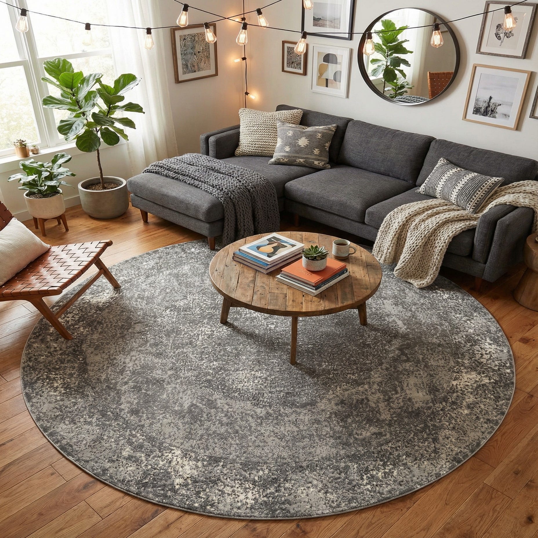 This rug works well in contemporary and transitional interiors where a muted, textural anchor is needed. Place it beneath a round dining set to define the meal area, under a living room seating group to soften hard lines, or in a bedroom seating nook to add a quiet, cohesive layer. The gray-and-ivory tones pair easily with cool metals and soft linens or warm wood furniture and layered textiles for a relaxed, collected look.