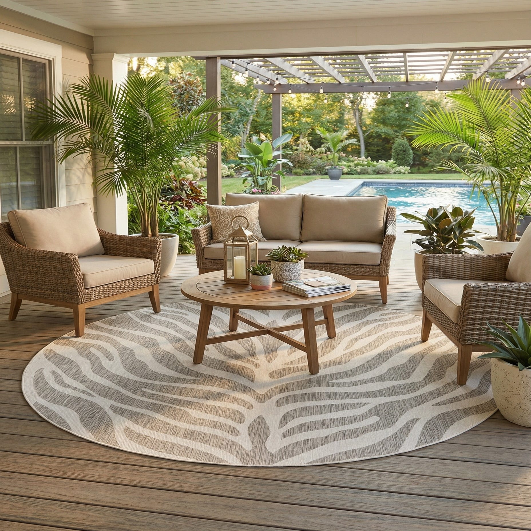 From the Outdoor Safari Collection, this round rug is a versatile addition to any outdoor or indoor space. It features a sophisticated pattern with zebra-inspired stripes that radiate from the center in shades of gray and ivory. The background color of gray provides a neutral canvas that complements the organic lines of the design, allowing for easy integration into various decor styles.