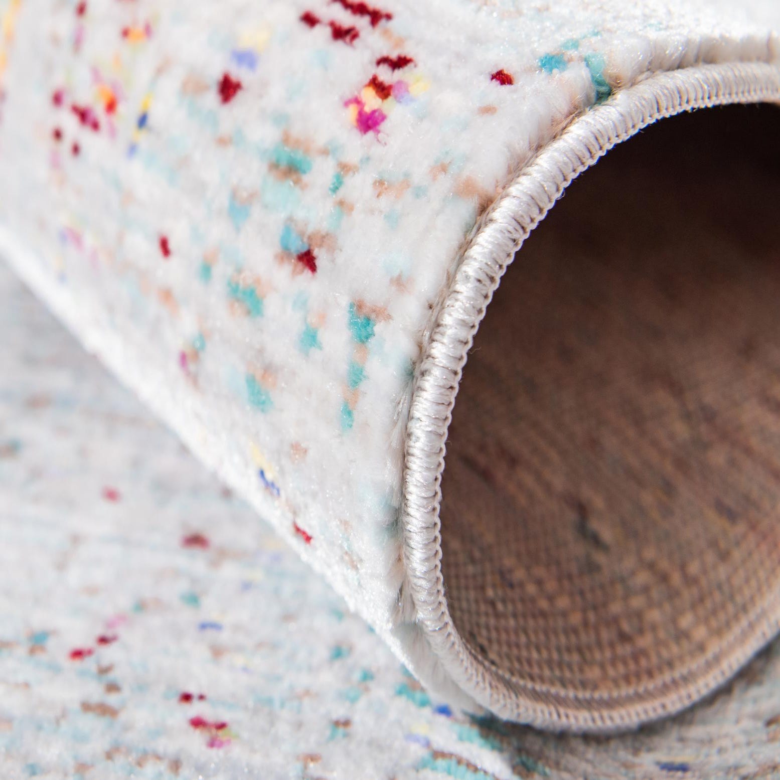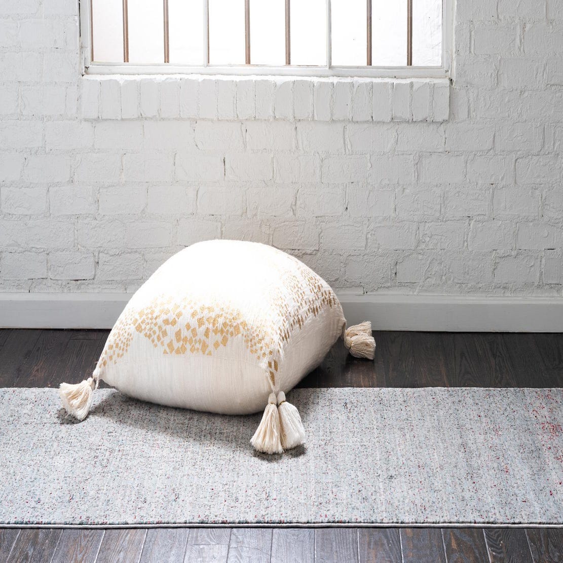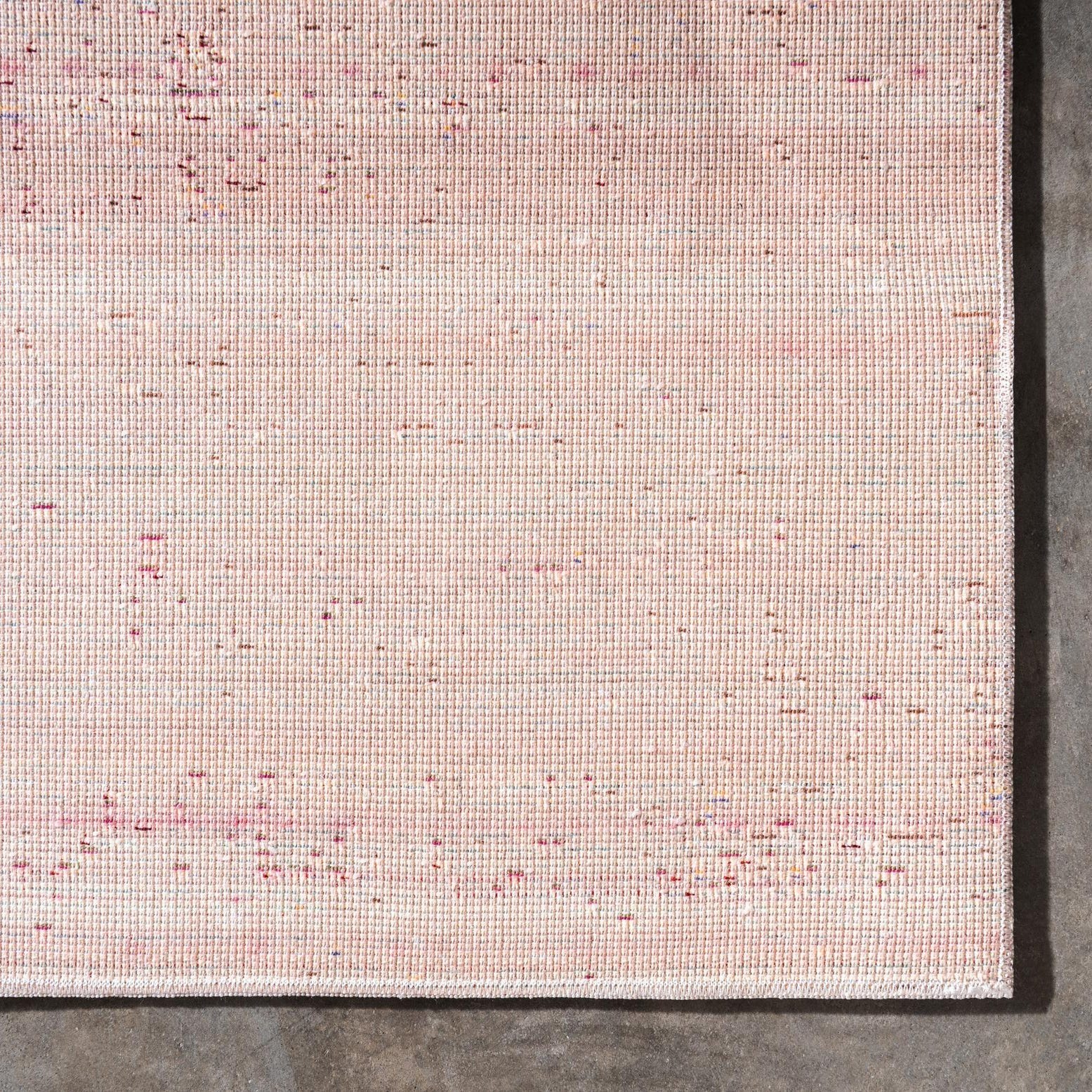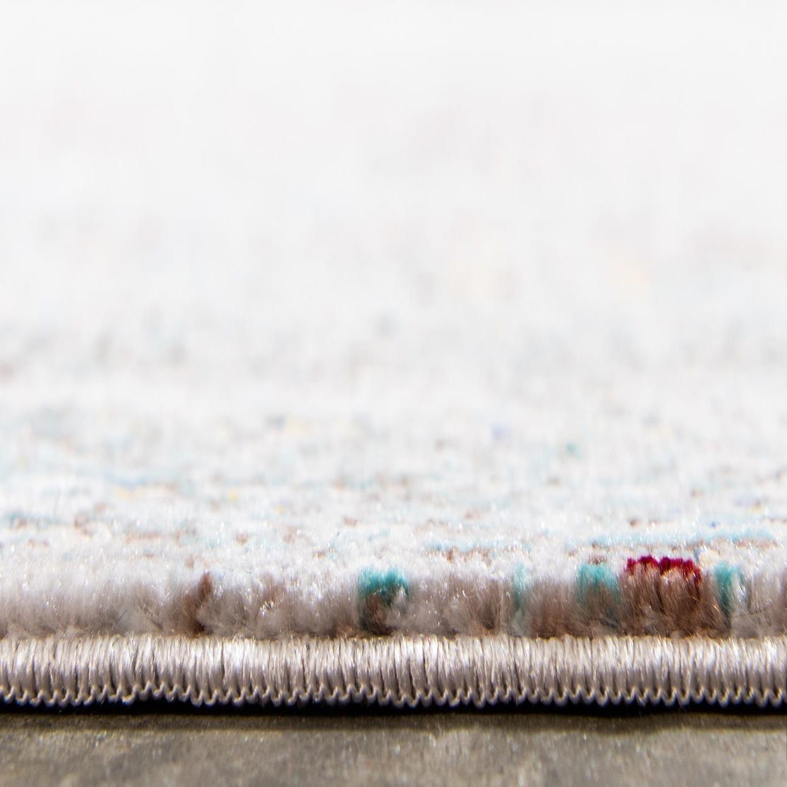 A soft, low-profile runner with a subtle, mottled pattern across a gray field, this machine-made rug is crafted from 100% polyester. The surface has a slightly slubbed texture and a gentle, low sheen that invites touch while maintaining a streamlined look. Tiny flecks of burgundy, green, light blue, peach, puce, yellow and ivory are dispersed throughout the ground, creating a quiet, multi-tonal effect that reads as layered and nuanced rather than busy.