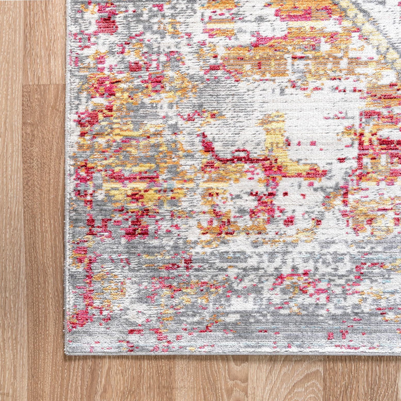 Machine-made from 100% polyester, this runner has a low, softly textured pile that feels smooth underfoot while offering subtle dimension from its slightly variegated weave. A cool gray ground provides the foundation for a faded, vintage-inspired medallion and border that appear gently worn. Scattered, painterly specks of burgundy, orange, peach, yellow, tan, brown and cream punctuate the surface, creating a layered, distressed effect that gives the rug depth without heavy contrast.