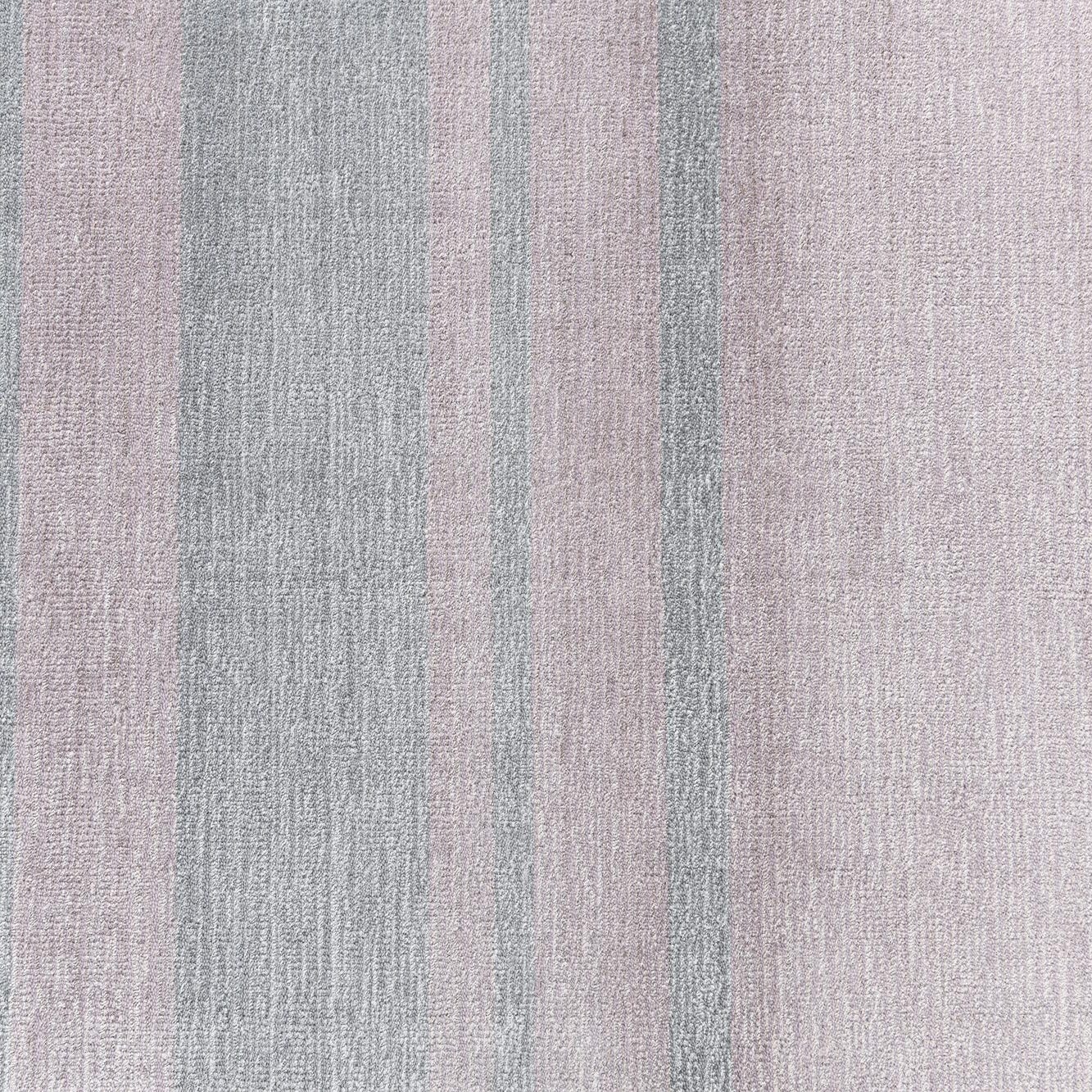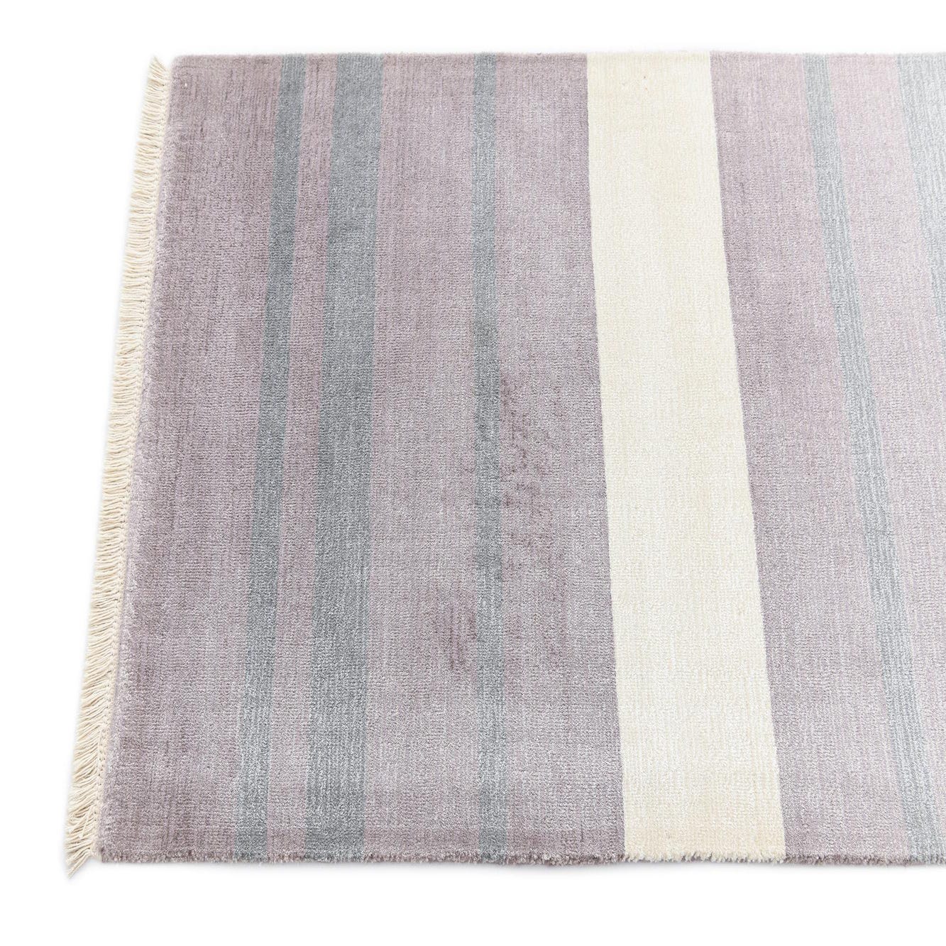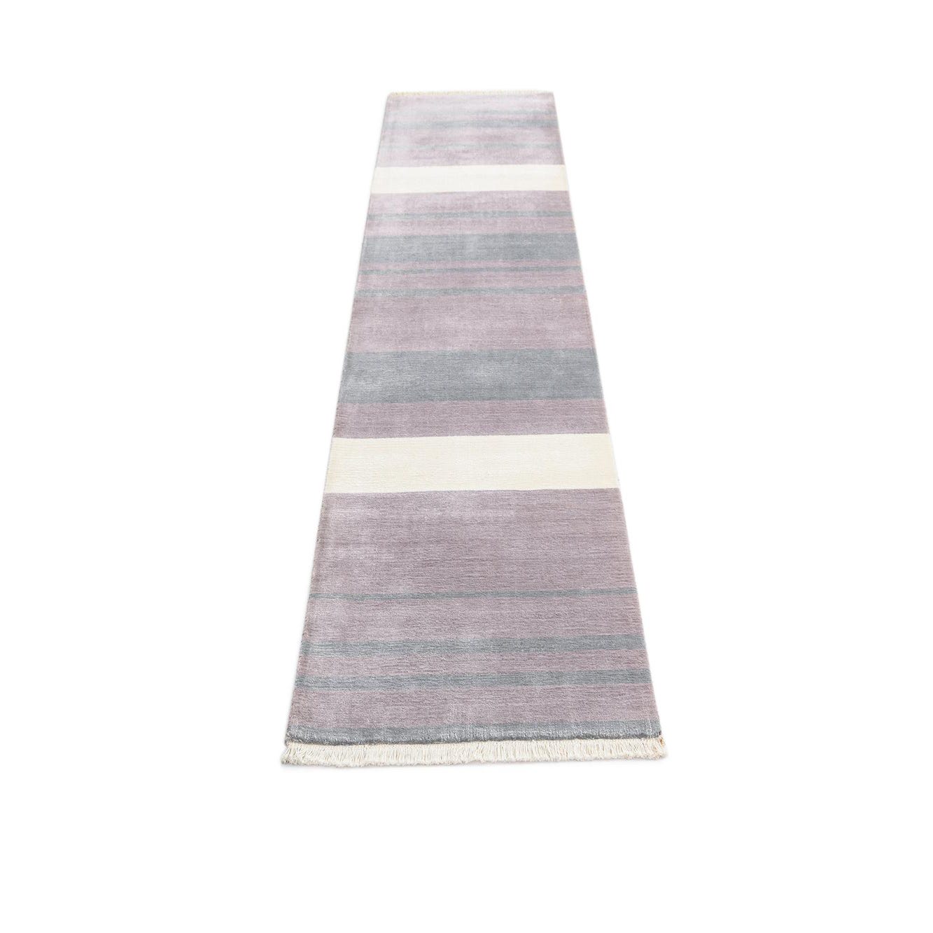 A 10 ft runner rug with horizontal stripes in varying shades of gray, silver, and light lavender, featuring fringed ends.