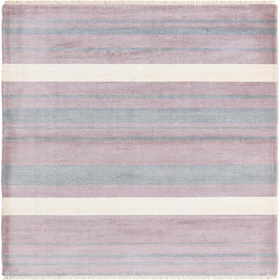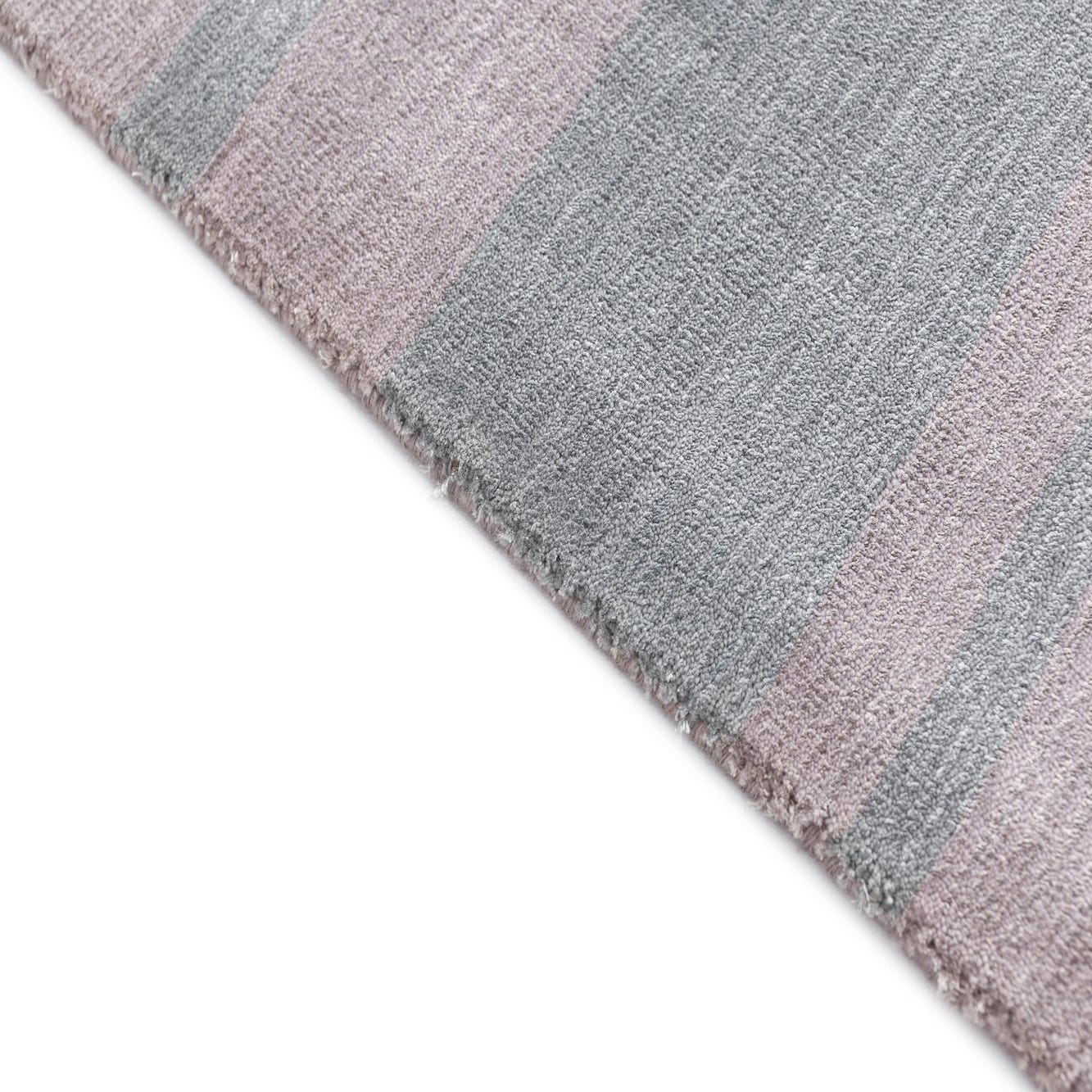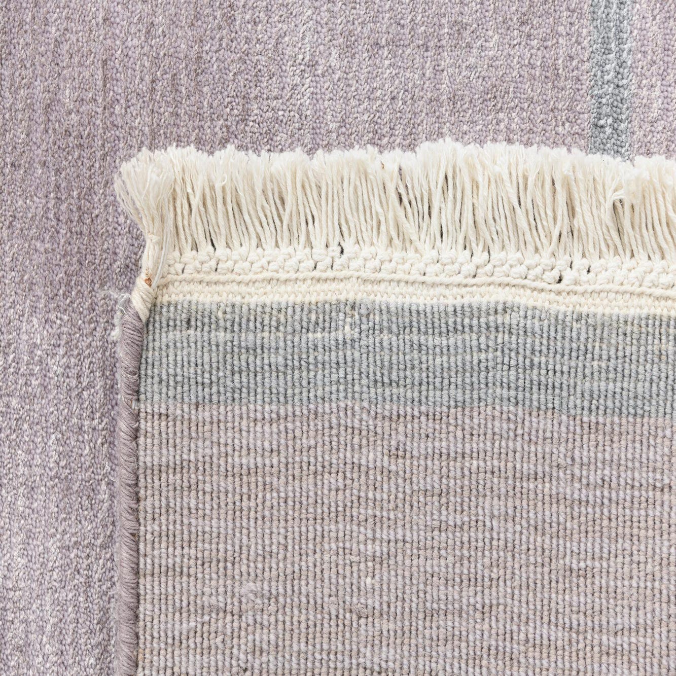 A 10 ft runner rug with horizontal stripes in varying shades of gray, silver, and light lavender, featuring fringed ends.