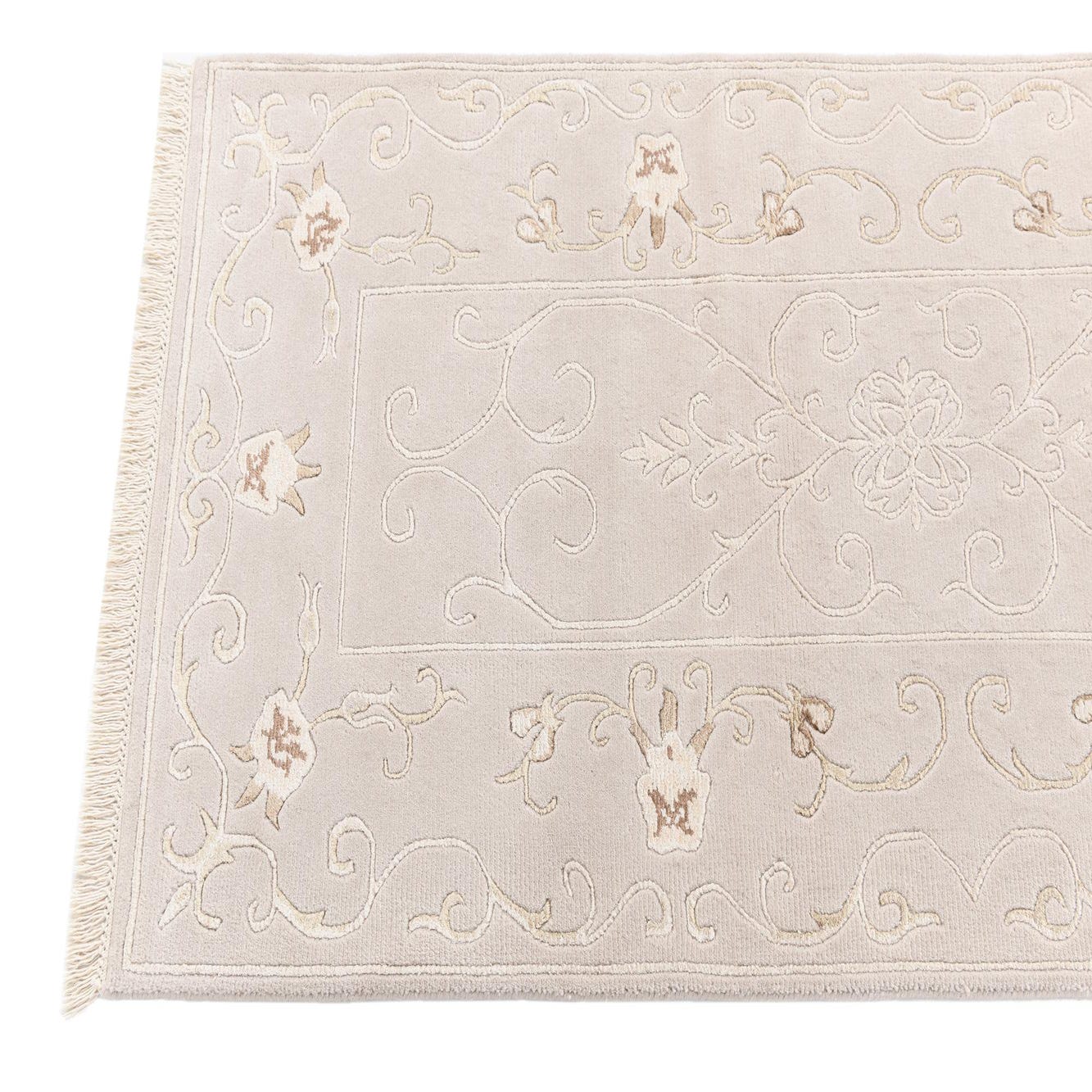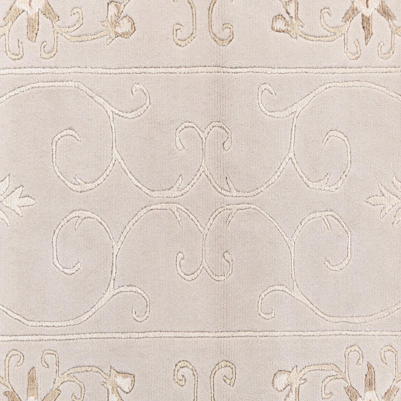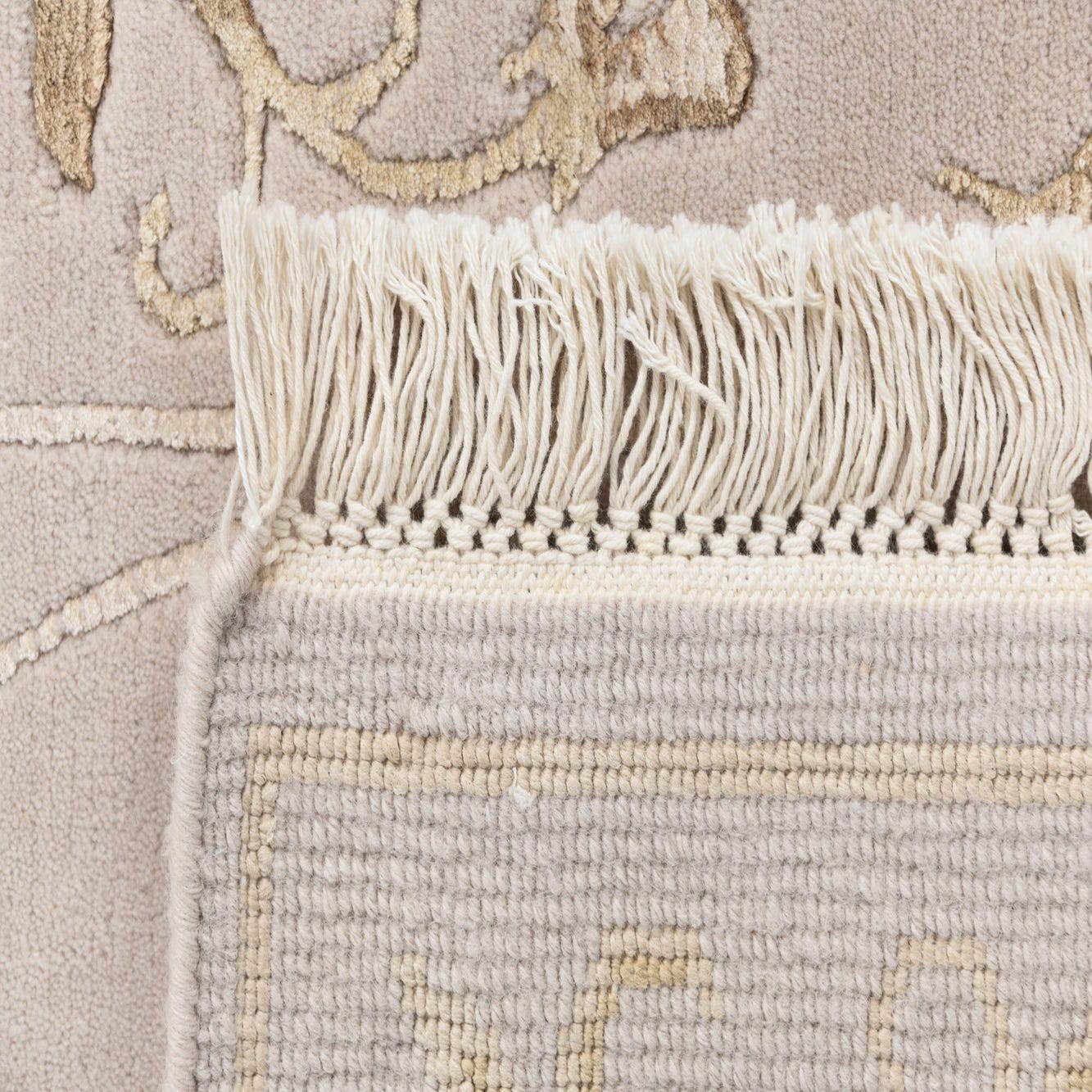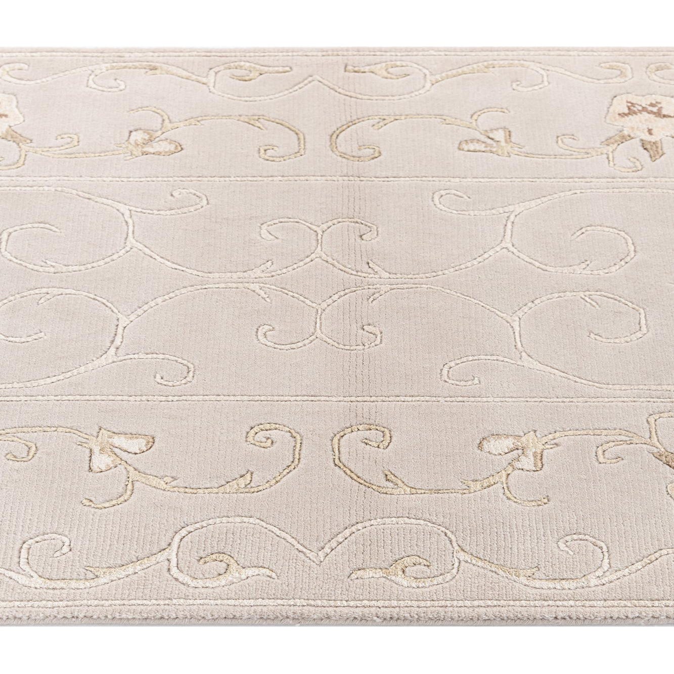 A 10 ft runner rug in light gray with an intricate modern Persian pattern in lighter gray and subtle gold accents.