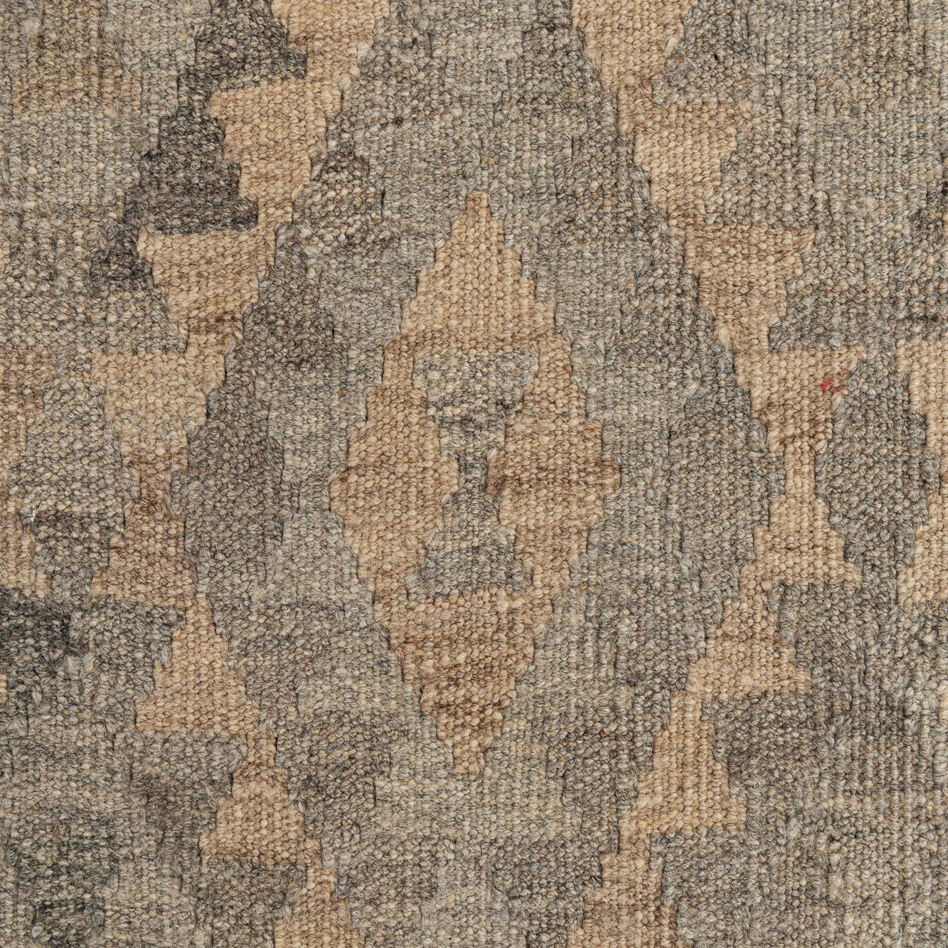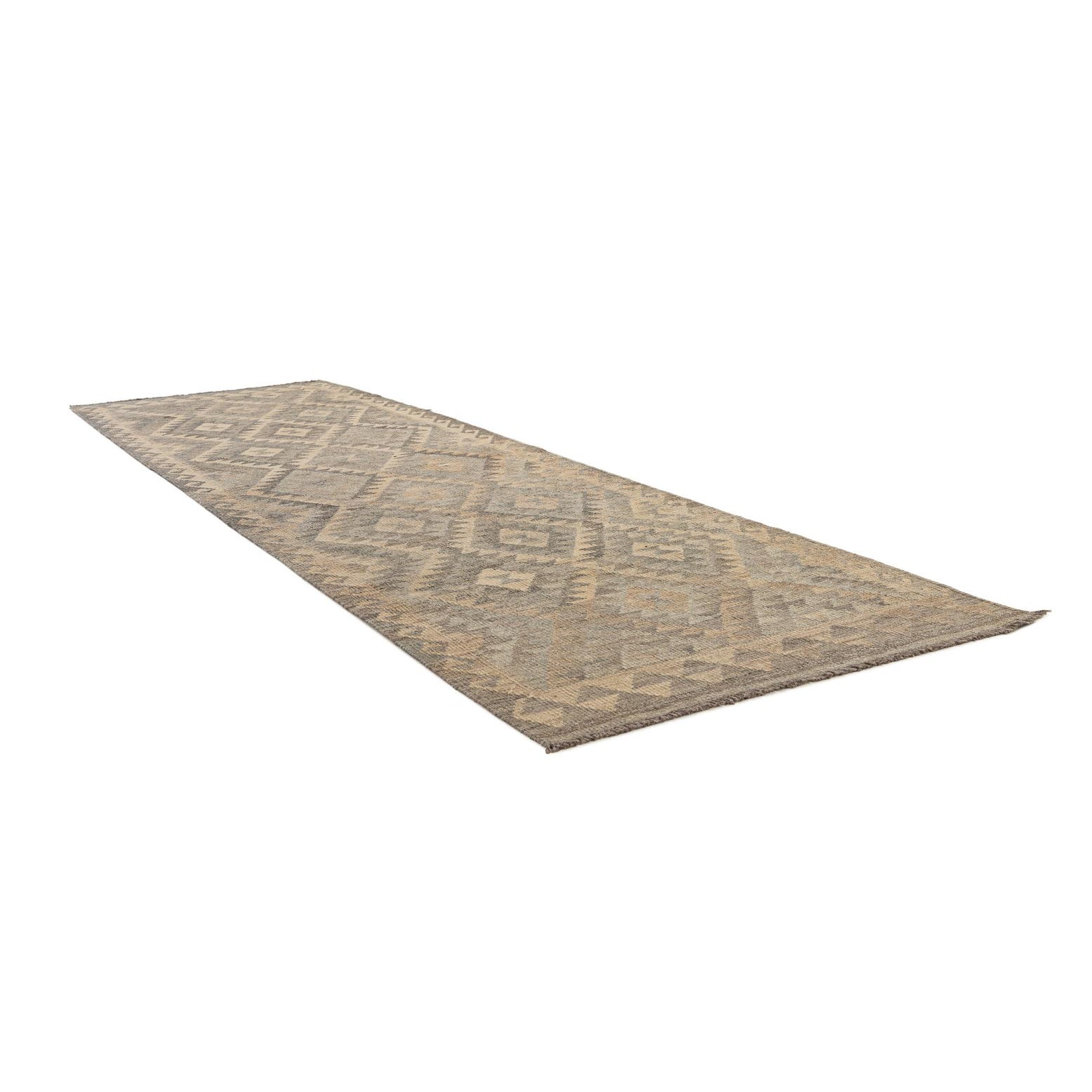 A 10 ft runner rug in shades of gray and beige with a tribal geometric diamond pattern, perfect for a hallway.