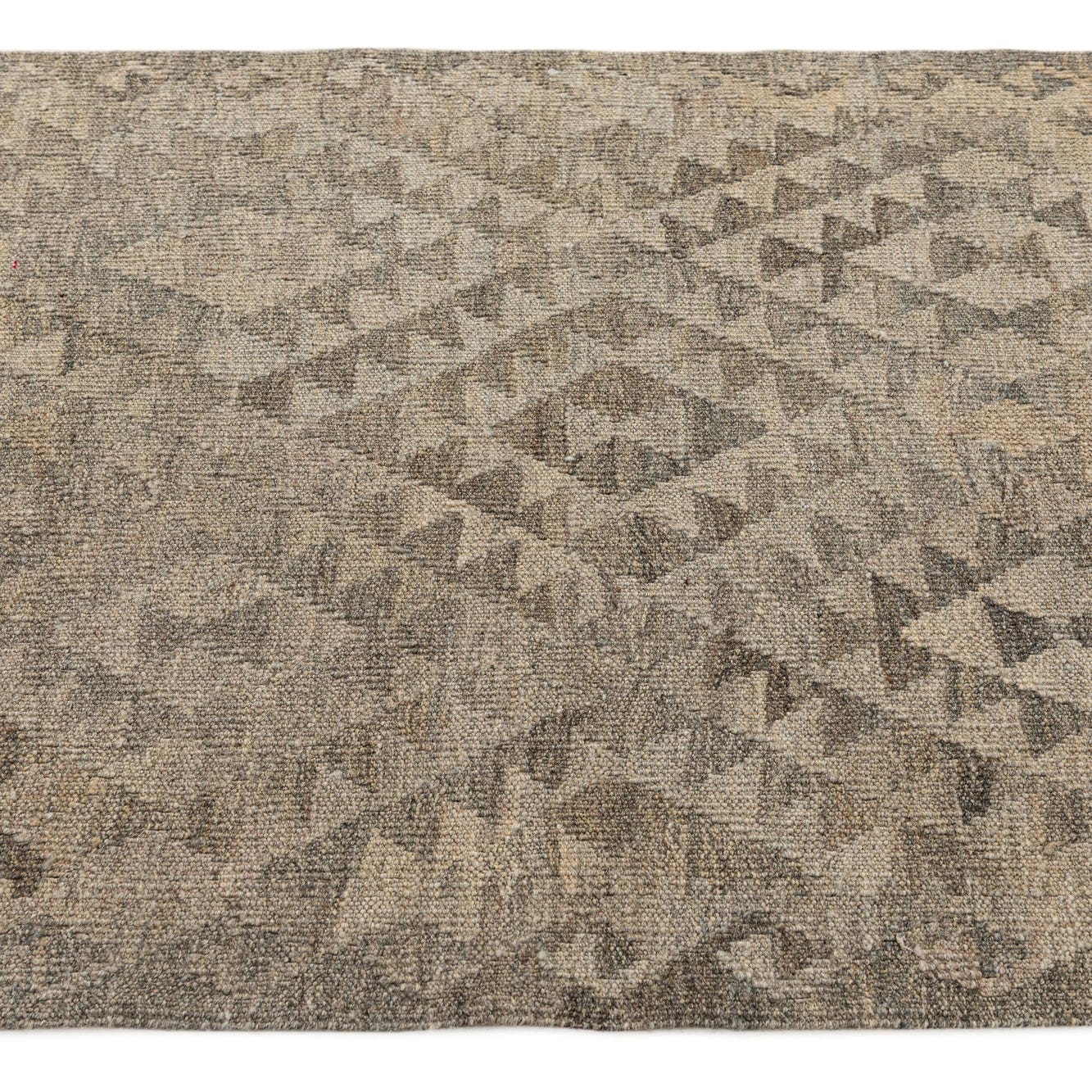 A 10 ft runner rug in gray and silver tones with a tribal geometric pattern, made of flatweave wool.