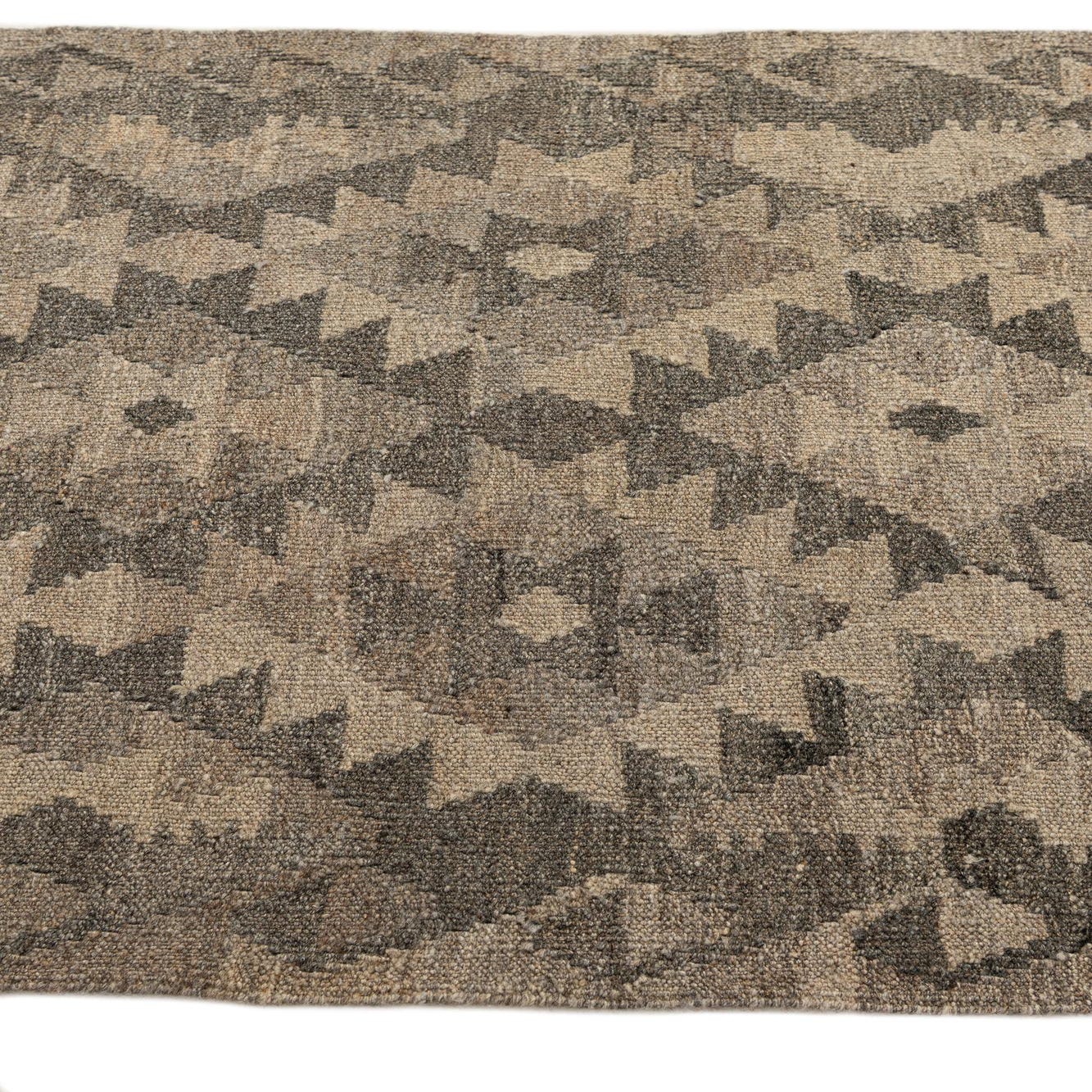 A 10 ft runner rug featuring a gray and silver tribal geometric pattern, perfect for a hallway.