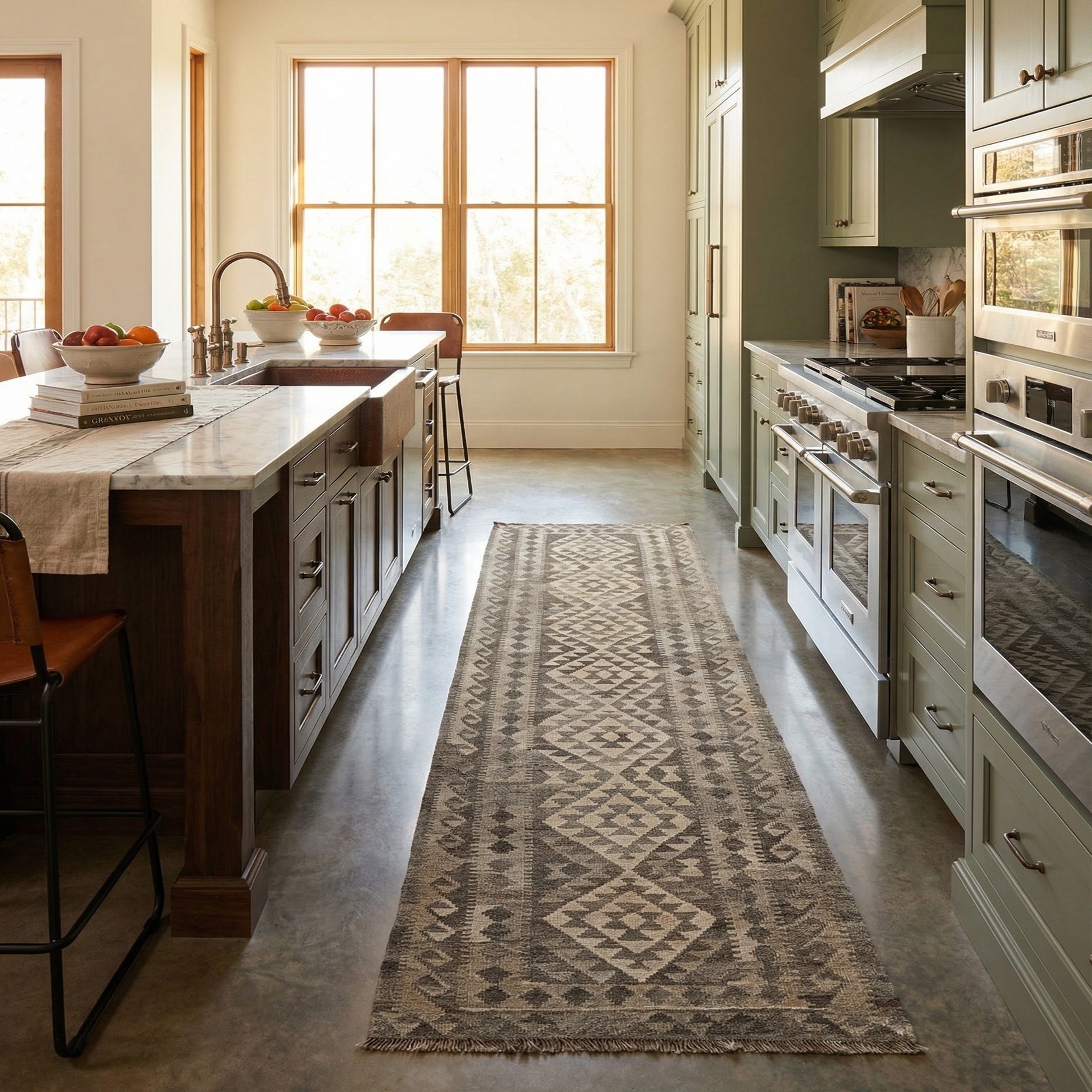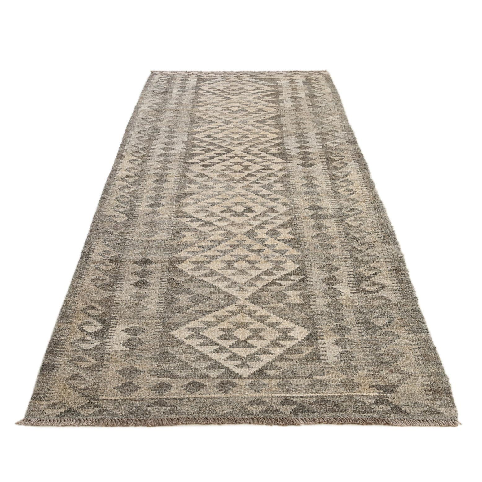 A 10 ft runner rug in shades of gray and silver, featuring a tribal geometric pattern, perfect for a hallway.