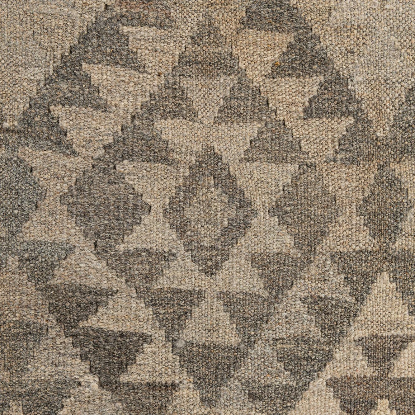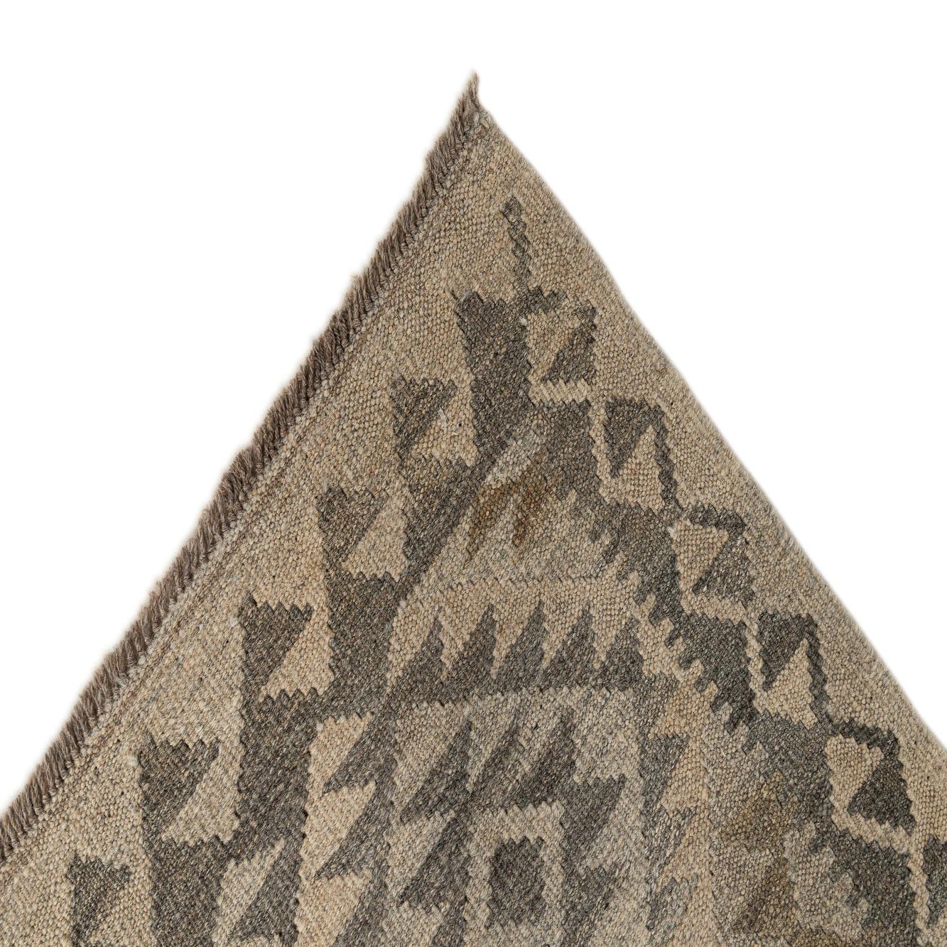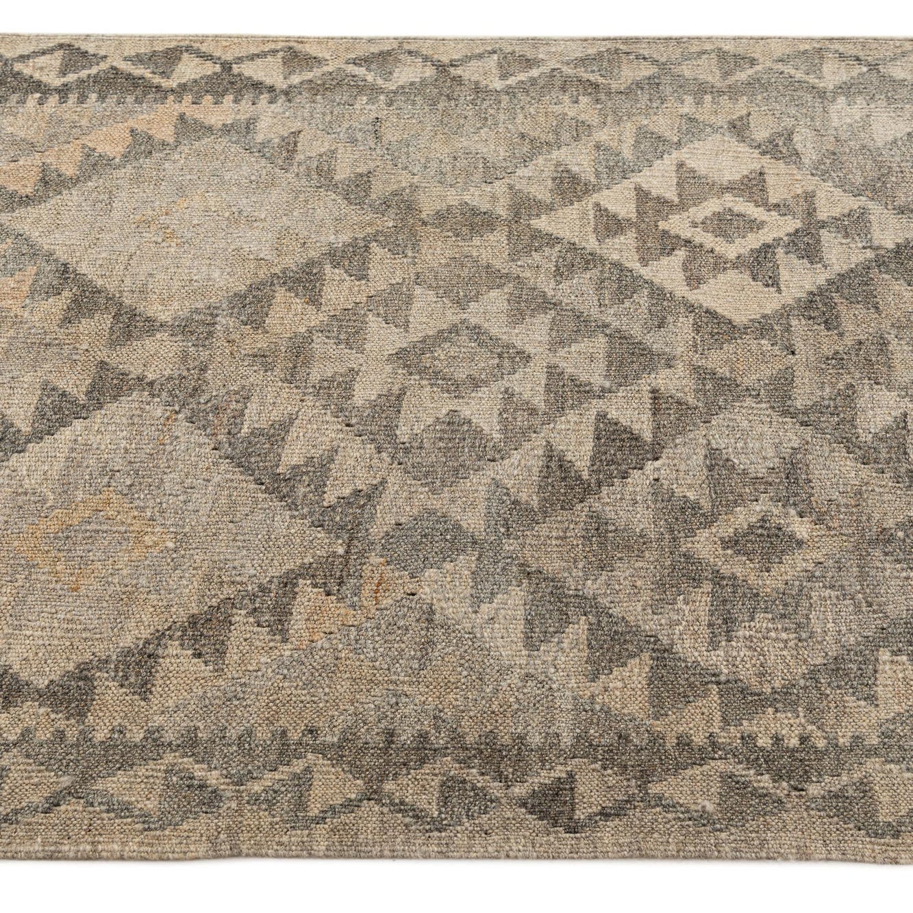 A 10 ft runner rug from the Kilim Maymana collection, featuring a tribal geometric pattern in shades of gray and silver.