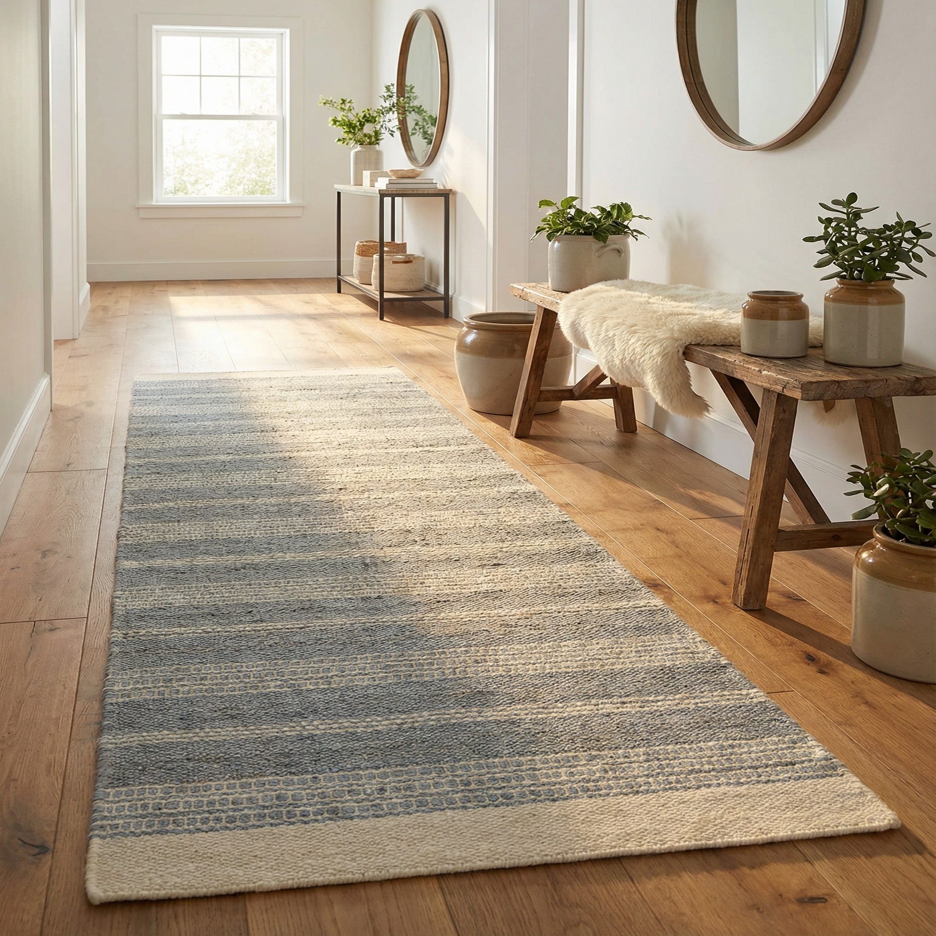 The flatwoven construction produces a low-profile, tactile surface: jute provides a firm, natural grain while wool offers a softer touch and subtle depth where fibers catch the light. Ideal for hallways, entryways, or narrow kitchen aisles, it pairs well with light wood floors and linen upholstery for a Scandinavian or coastal vibe, and with leather accents and matte metal finishes for a modern farmhouse or transitional scheme.