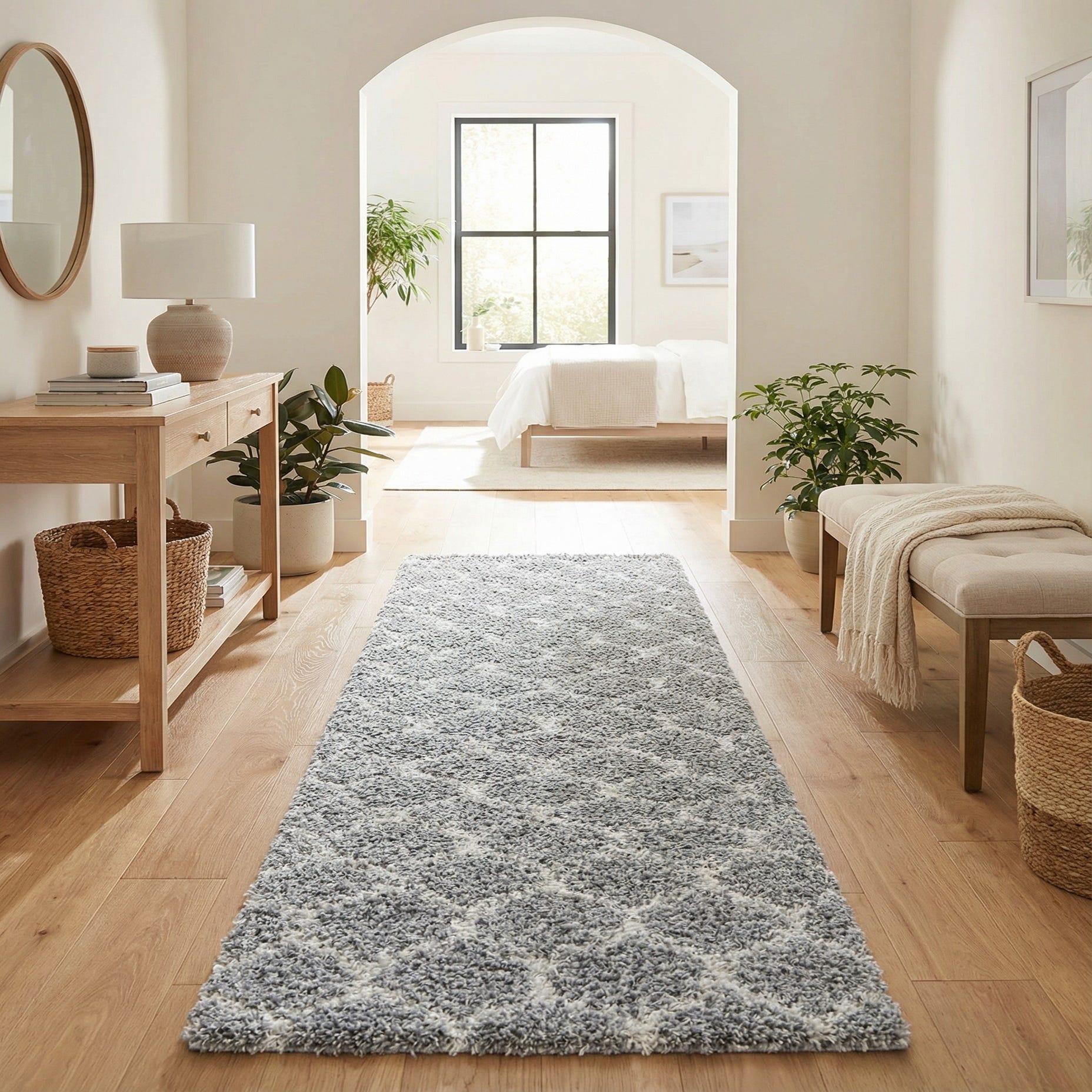 This runner works well in narrow spaces where a touch of texture and pattern can make a big impact — think hallways, entryways, or flanking a bed. It pairs easily with contemporary or transitional interiors: layer it over hardwood for a warm contrast, use it in a Scandinavian-inspired scheme with clean lines and pale woods, or add it to a cozy, neutral living area to soften harder surfaces. The versatile palette and tactile pile make it an easy addition to calm, understated rooms as well as livable, family-focused spaces.