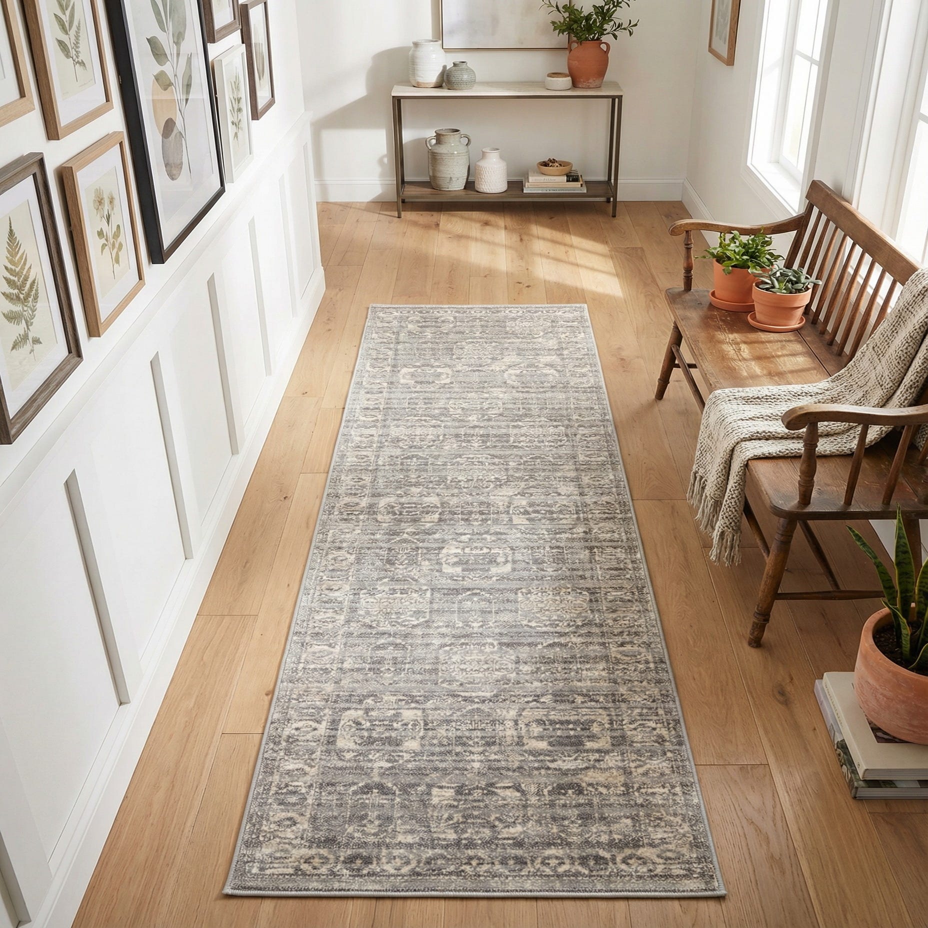 This runner works well in narrow or transitional spaces where you want subdued patterning—think a long hallway, galley kitchen, or alongside a bed—bringing calm texture without strong contrast. It pairs easily with natural wood floors, crisp white trim, and neutral upholstery, and complements both modern-traditional and contemporary farmhouse interiors. Use it to anchor a row of console tables and lamps, to soften high-traffic corridors, or layered beneath a narrow bench in an entryway for added visual warmth.
