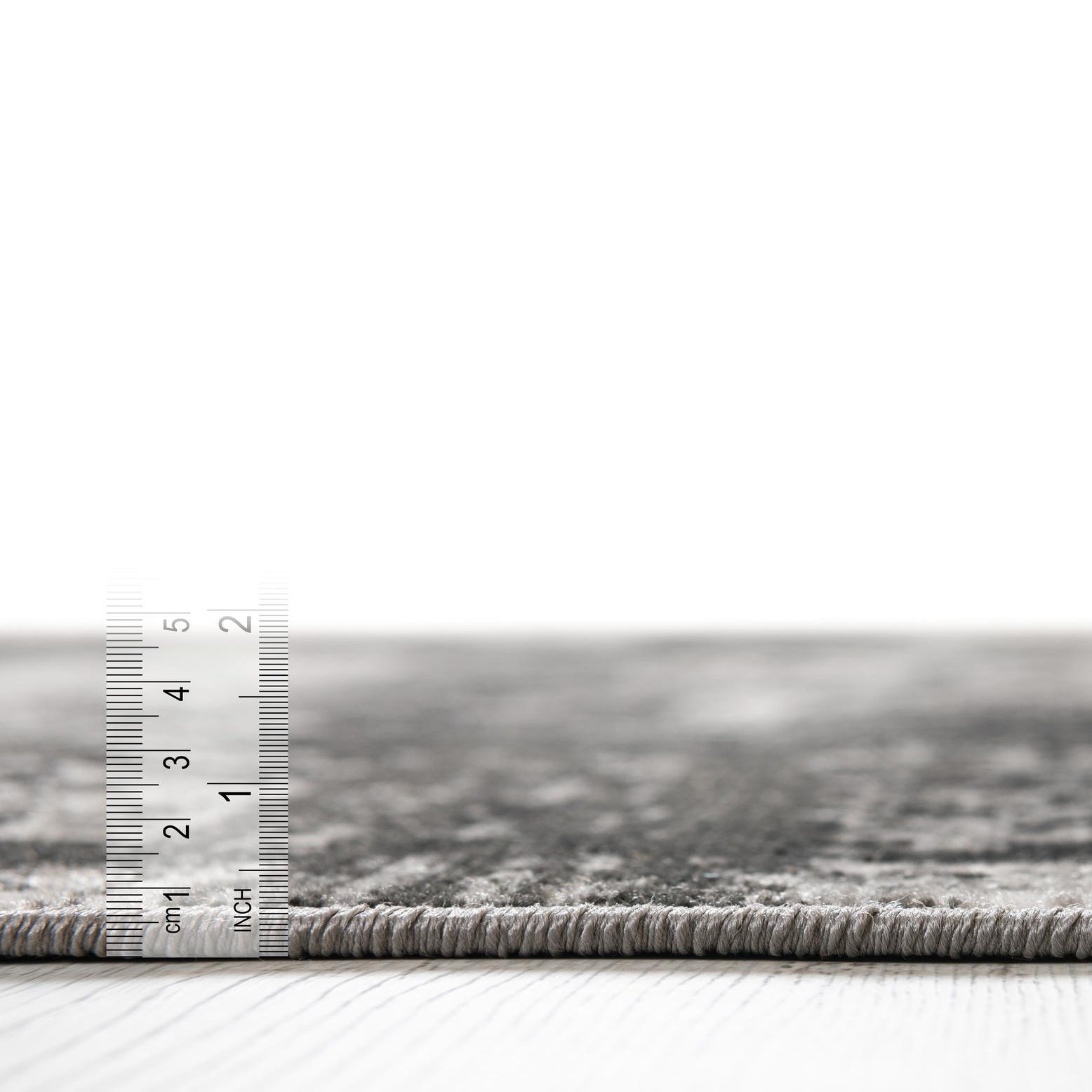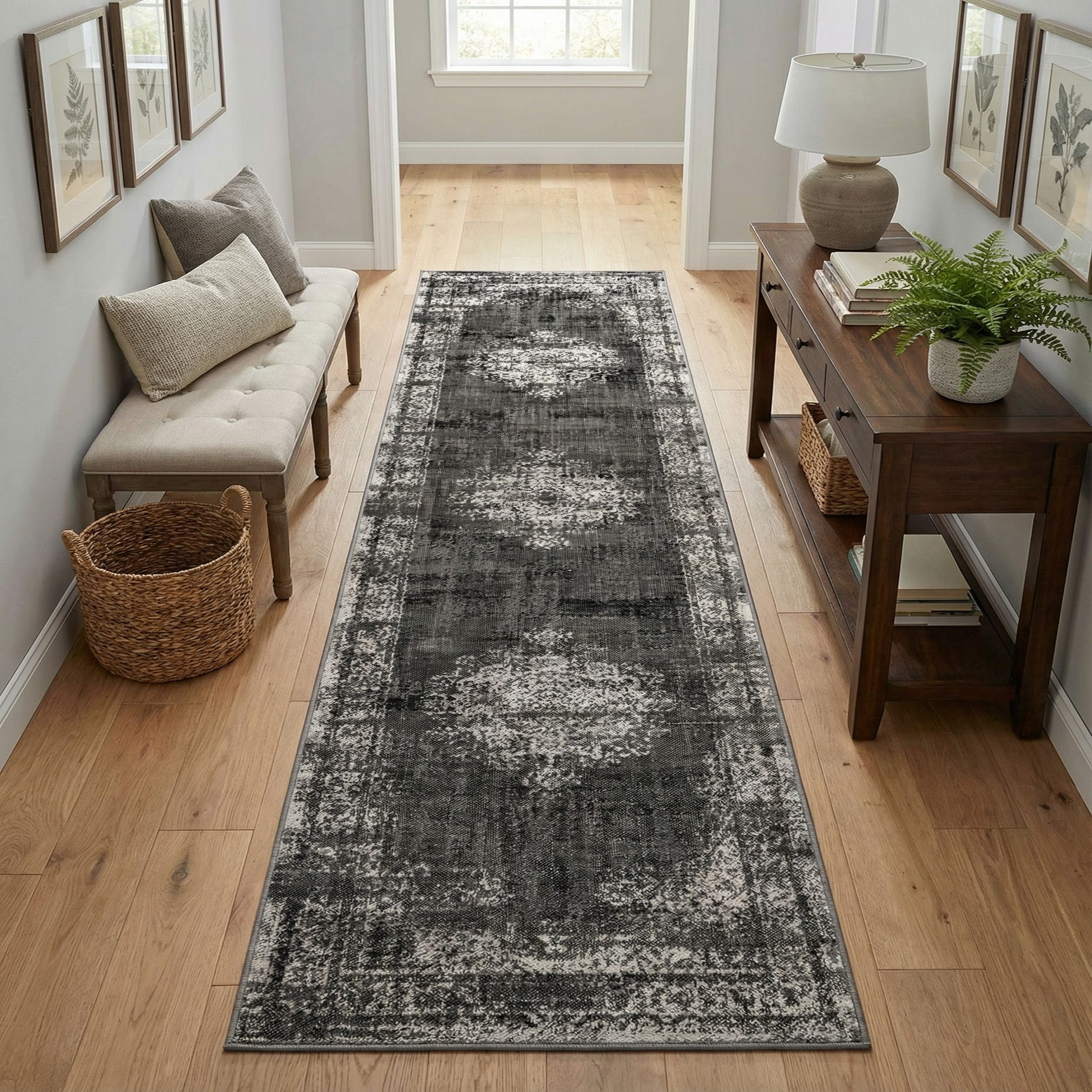 A 10 ft runner rug in shades of gray and silver with a distressed medallion and tribal pattern, ideal for a hallway.