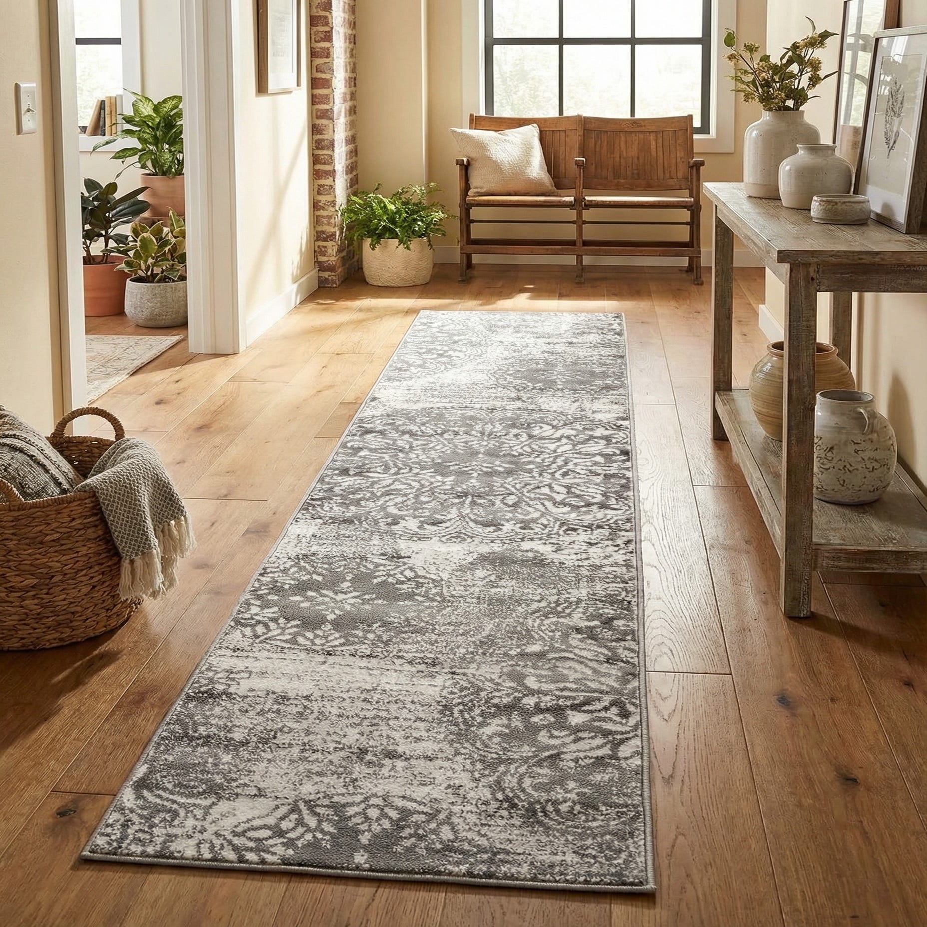 Machine made from 100% polypropylene, the rug has a low, dense pile that feels smooth underfoot and shows a subtle sheen where the fibers catch the light. Its resilient construction suits high-traffic narrow spaces: place it in a hallway or entry, alongside a bed, or in a galley kitchen to anchor a long sightline. Style pairings include modern farmhouse and transitional interiors, minimalist or monochrome schemes that benefit from pattern, or industrial spaces softened by muted tones and layered textures.