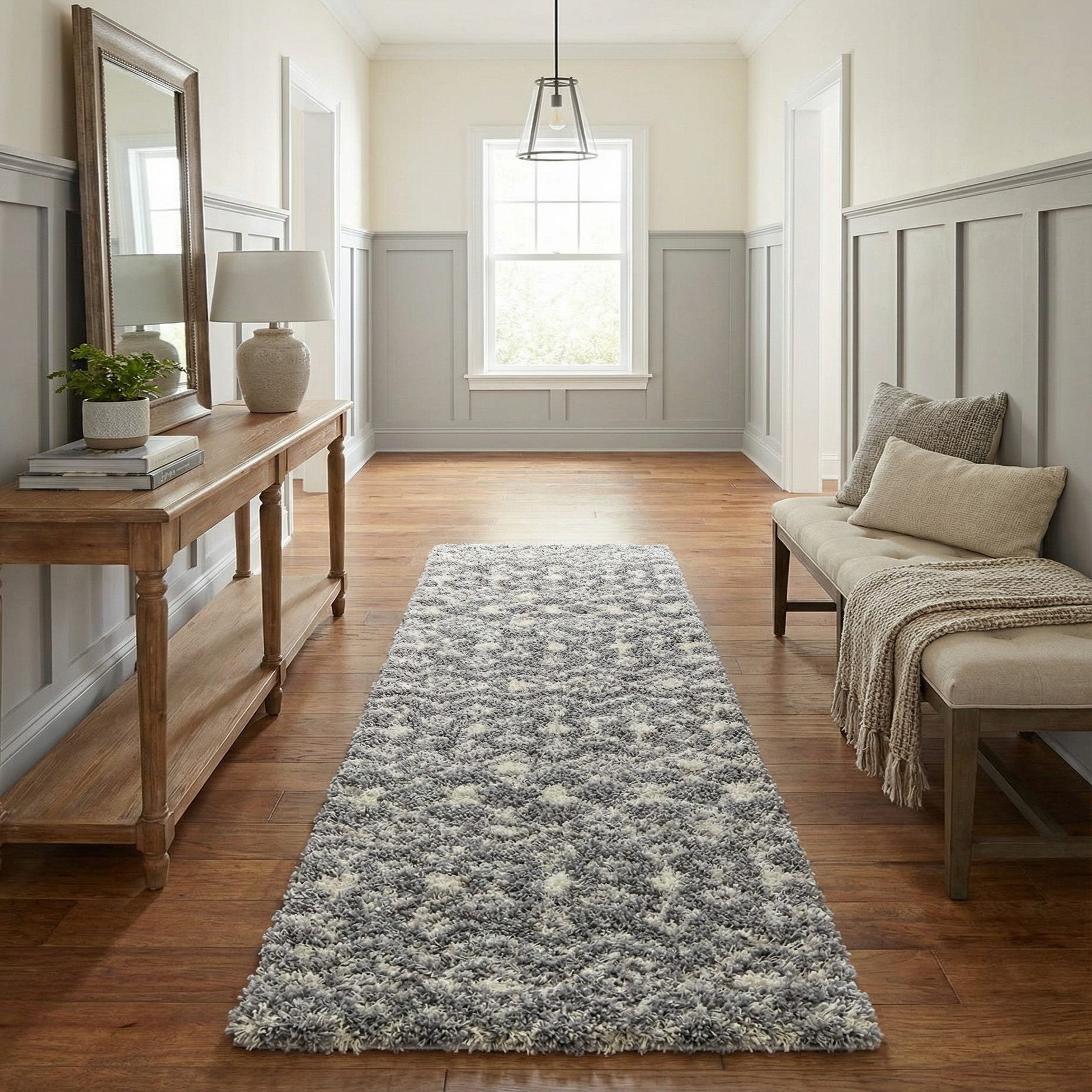 Machine-made of 100% polypropylene, this runner offers a cushioned feel and consistent texture along its length. Its neutral gray-and-ivory palette works well in contemporary and transitional interiors as well as Scandinavian or modern farmhouse schemes. Place it in a long hallway or entry, down the length of a kitchen, or alongside a bed to add softness underfoot and subtle geometric interest to narrow spaces; it pairs nicely with light woods, cool metals, and layered textiles.