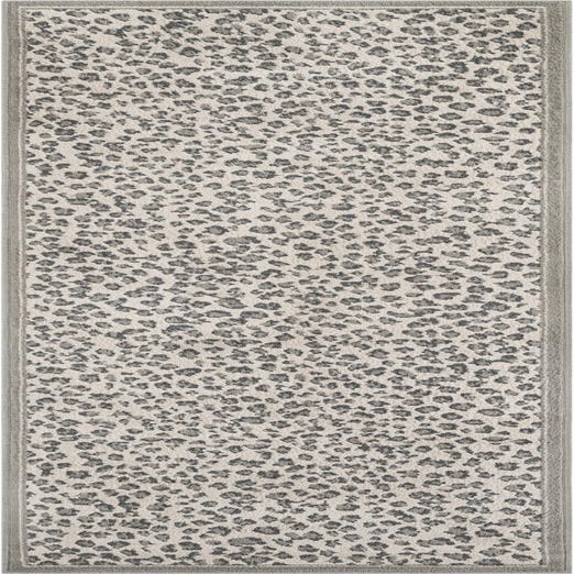 A subtle animal-print motif in ivory and black is set against a soft gray ground, creating a modern interpretation of a classic spotted pattern. The design reads as a field of irregular, naturalistic spots with a narrow gray border that frames the runner and gives a finished look. Machine-made from 100% polypropylene, the rug has a low-profile pile with a smooth, slightly cushioned feel underfoot and a consistent surface that highlights the contrast between the spot pattern and the background.