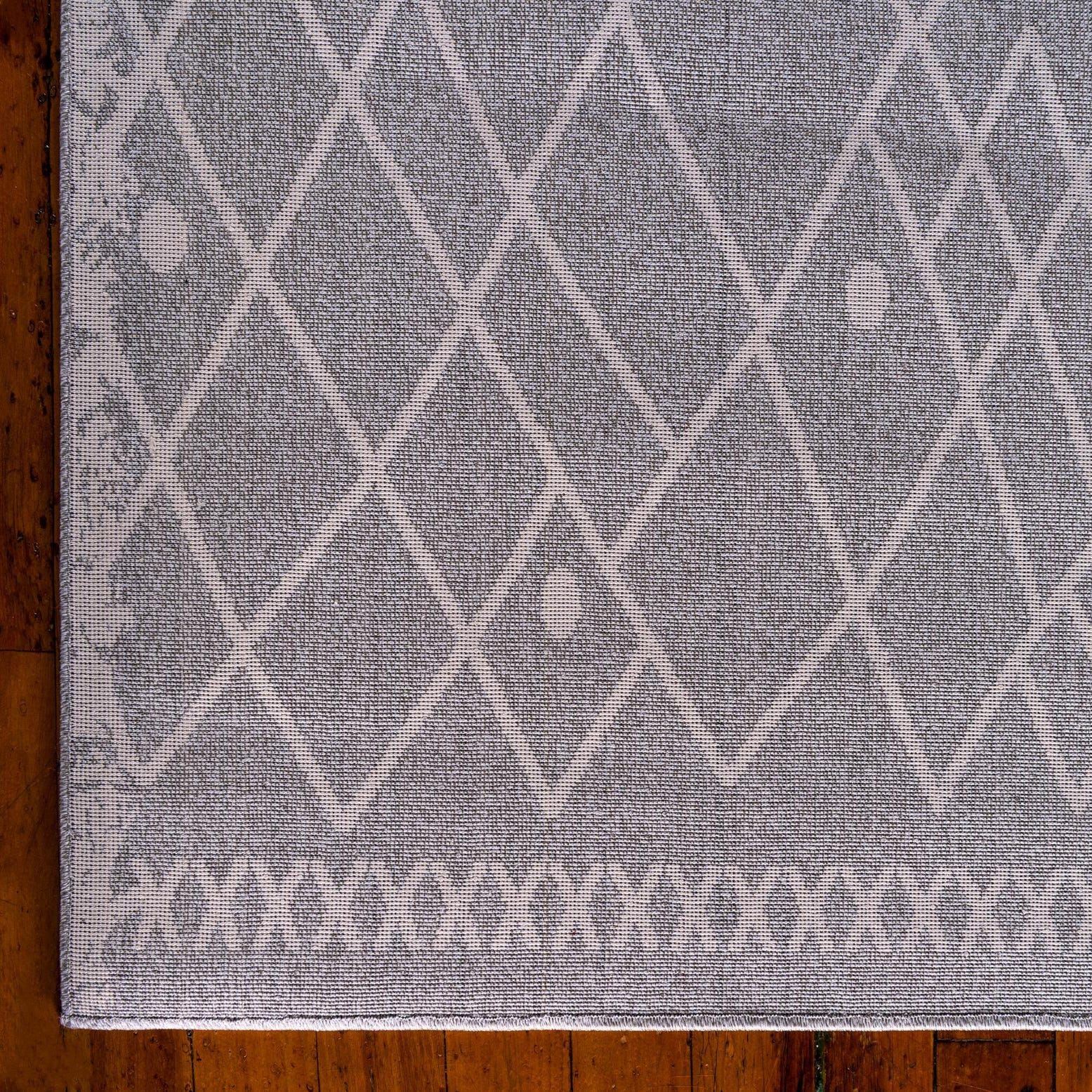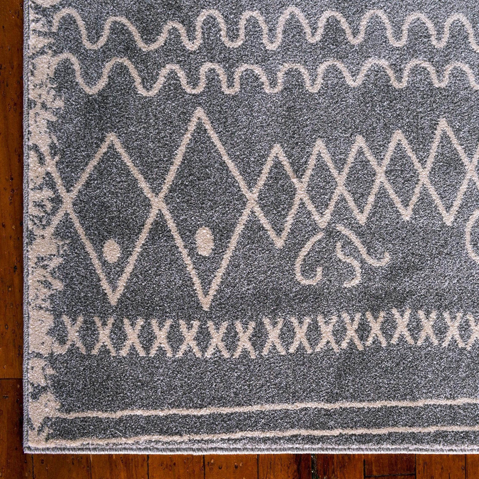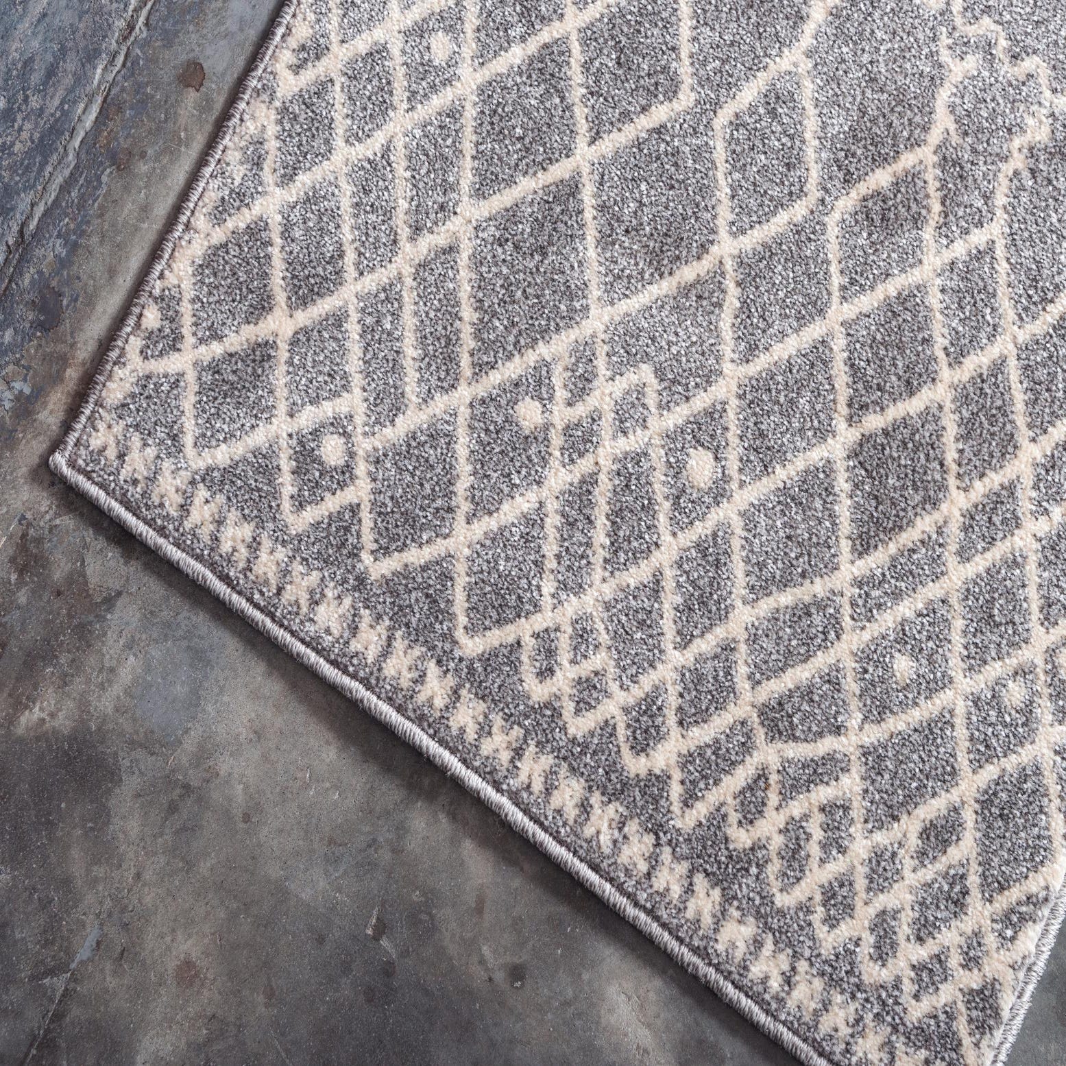 A soft gray field forms the backdrop for an ivory, geometric medley of diamond lattices, wavy bands and small dot accents that give this runner a handwoven-inspired character. The pattern alternates dense and open motifs for visual rhythm across the length of the rug, while the cut-pile ivory design sits in subtle low?high relief against the smoother gray surface, creating a gentle tactile contrast underfoot.