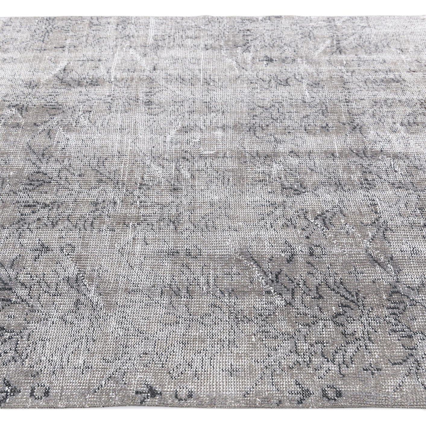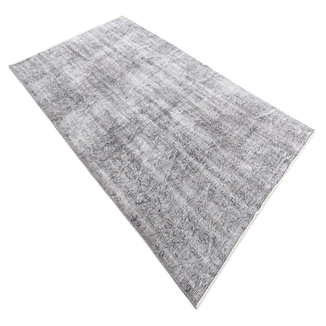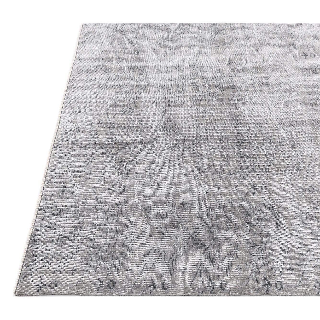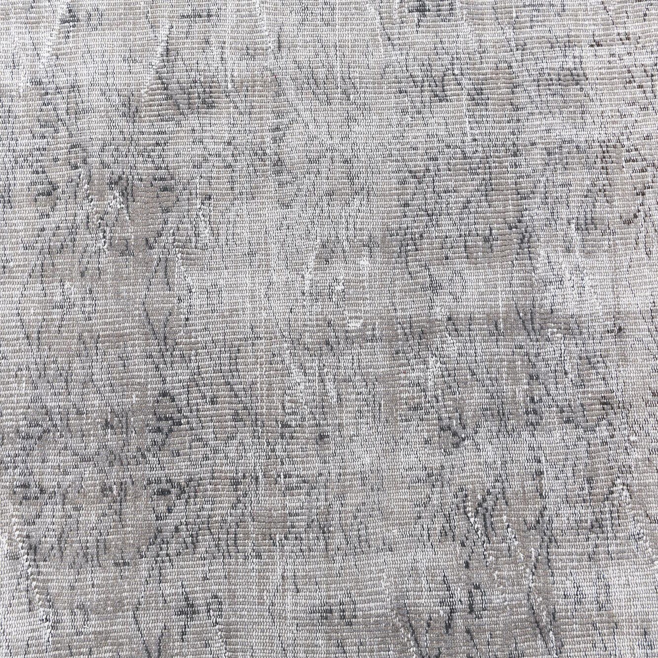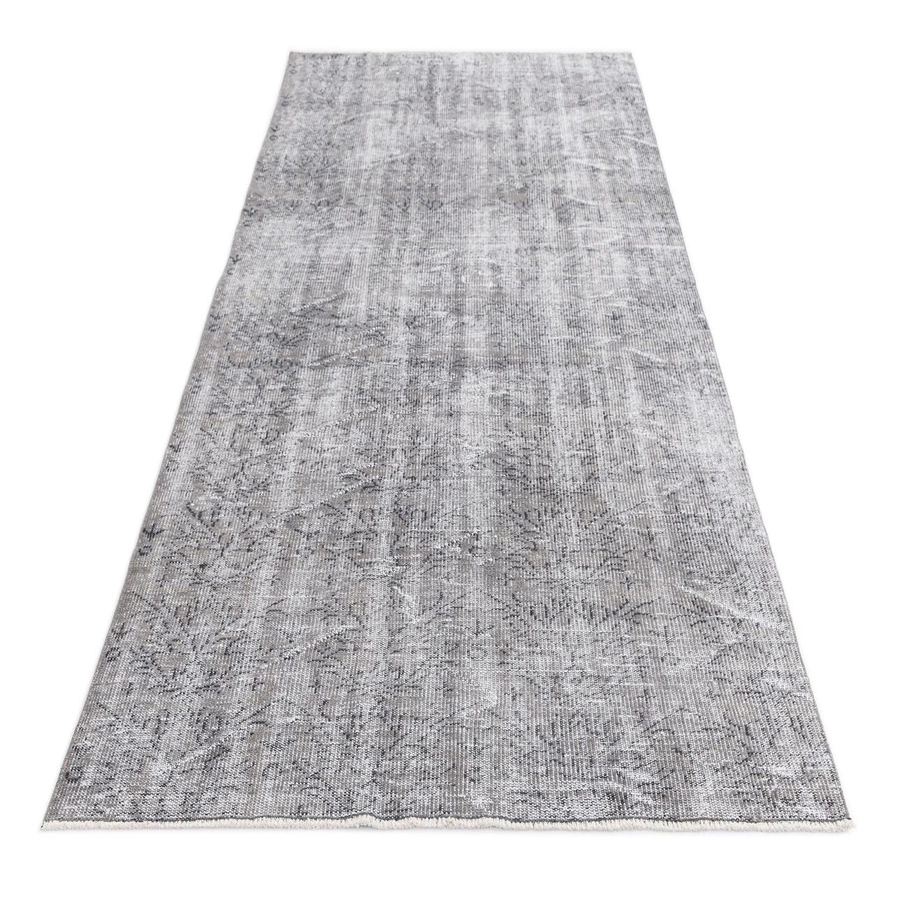 A 10 Ft Runner rug in shades of gray and silver with a distressed modern Persian pattern, ideal for a hallway.