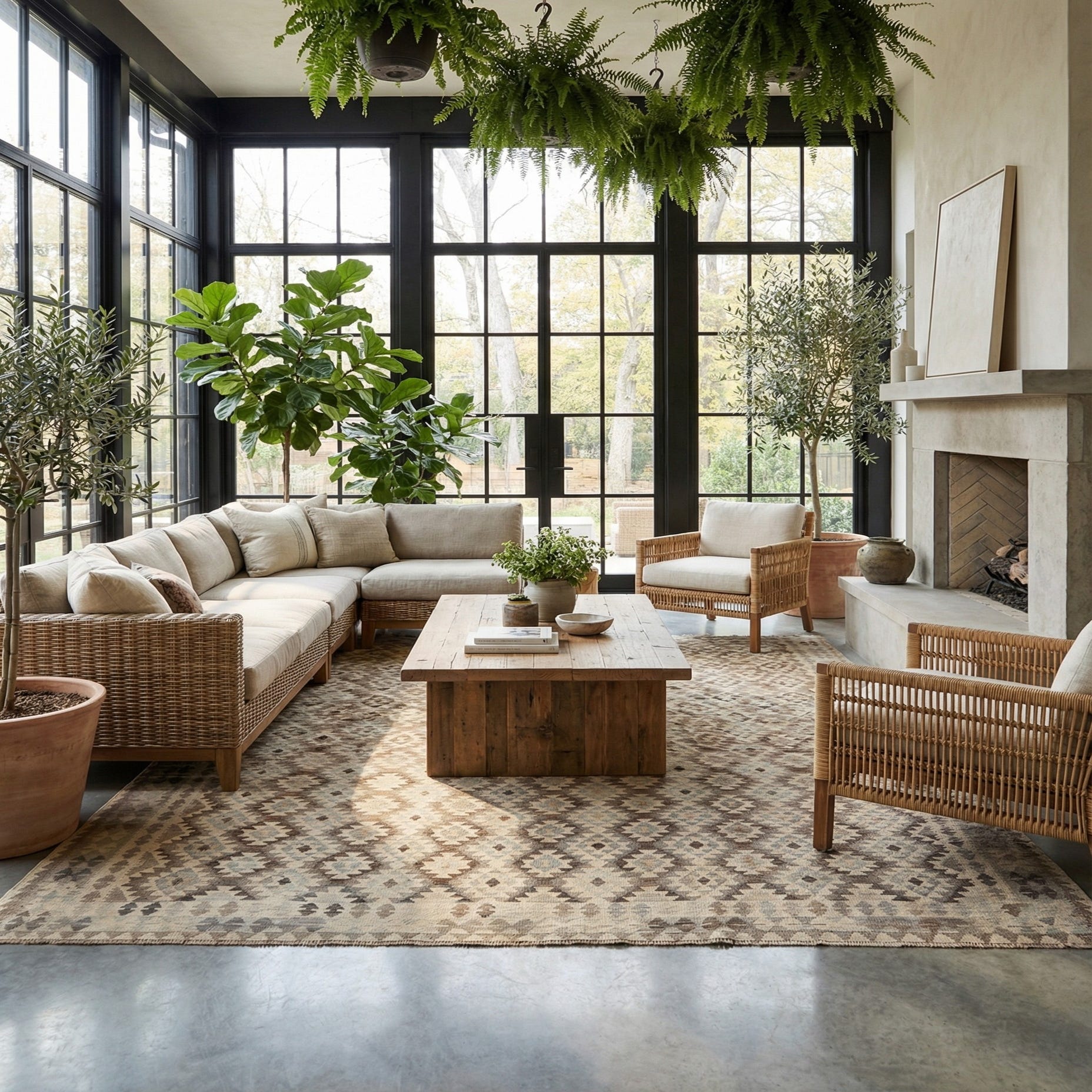 A 10' 0 x 10' 4 square Kilim Maymana rug featuring a tribal geometric pattern in various shades of gray and silver.