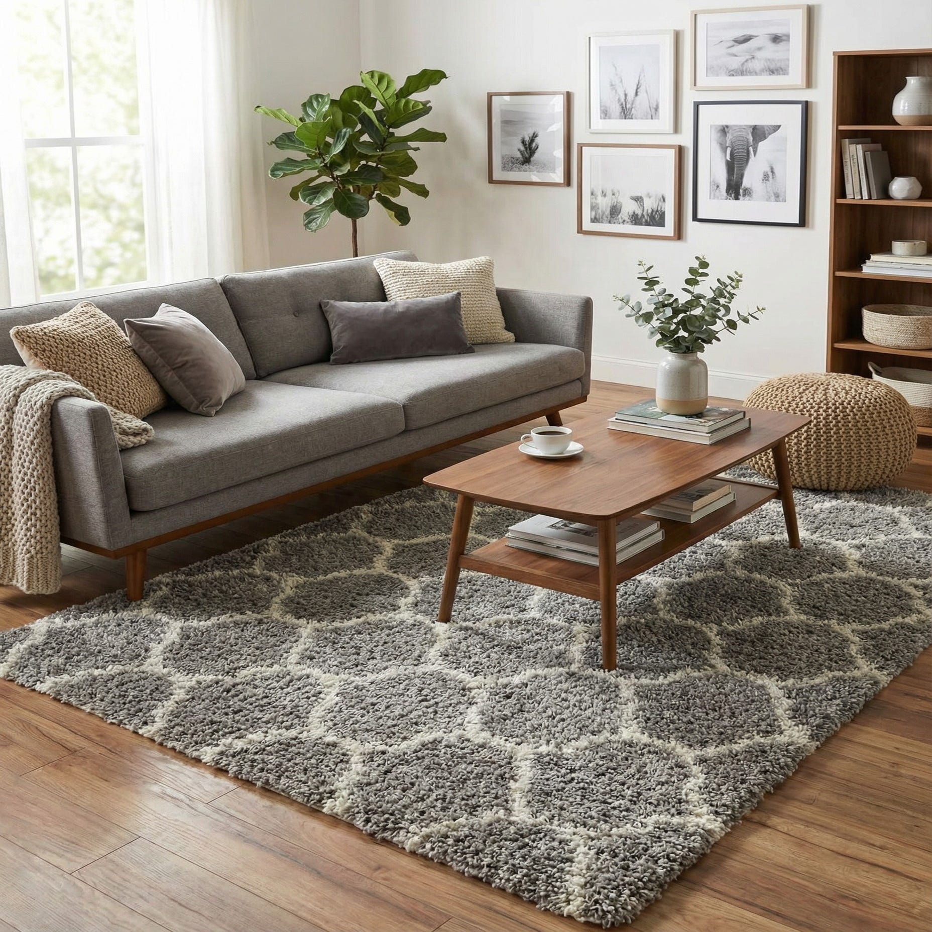 The surface has a shag pile that feels soft and inviting underfoot, with the lighter pattern sitting slightly higher than the background to produce subtle dimensional texture. This rug works well in living rooms as an anchor for seating arrangements, under a coffee table to add softness to a hard-surface floor, or in bedrooms to warm the space at the foot of the bed. It also fits nicely in transitional, modern, or Scandinavian-inspired interiors and pairs easily with light woods, metal accents, and linen upholstery.
