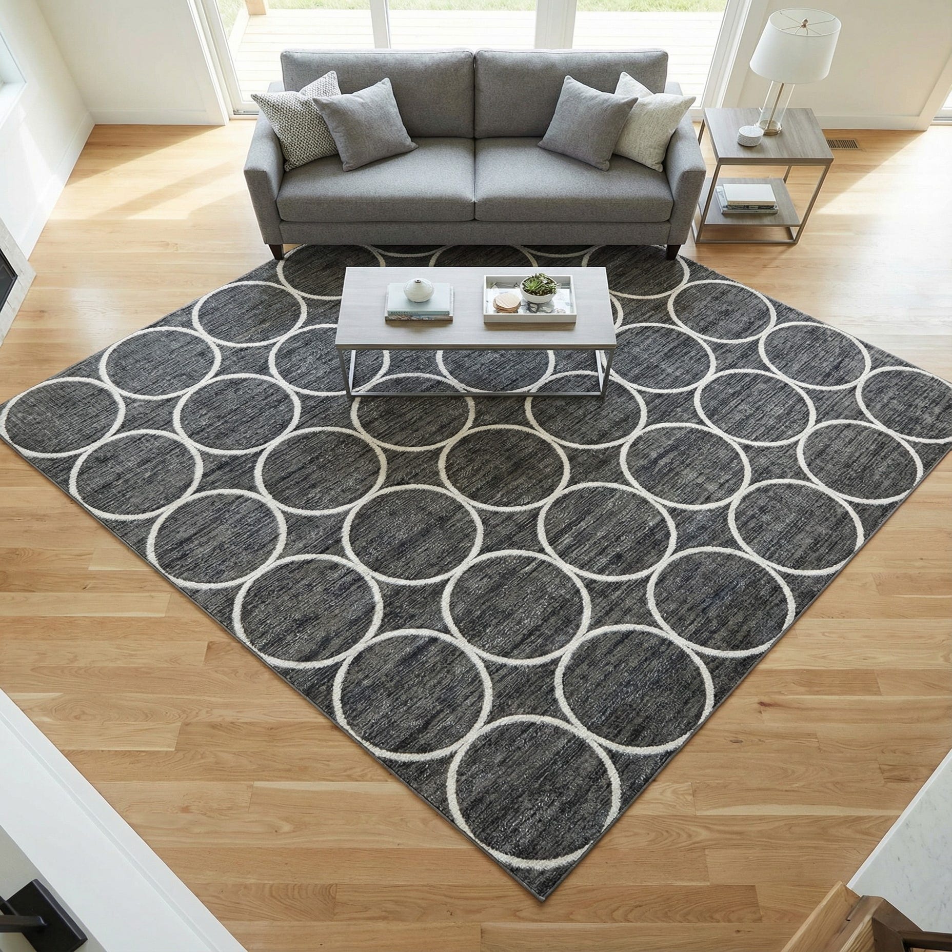 This carpet works well as an anchor in contemporary living rooms or open-plan seating areas, where the circular motif can soften straight-lined furniture and add visual interest to a neutral palette. It also pairs easily with industrial or Scandinavian schemes—try it beneath a coffee table to define a conversation area, under a dining set for a graphic foundation, or in a home office to introduce pattern without overwhelming the space. The gray and ivory palette complements wood finishes and metal accents while keeping other décor elements flexible.