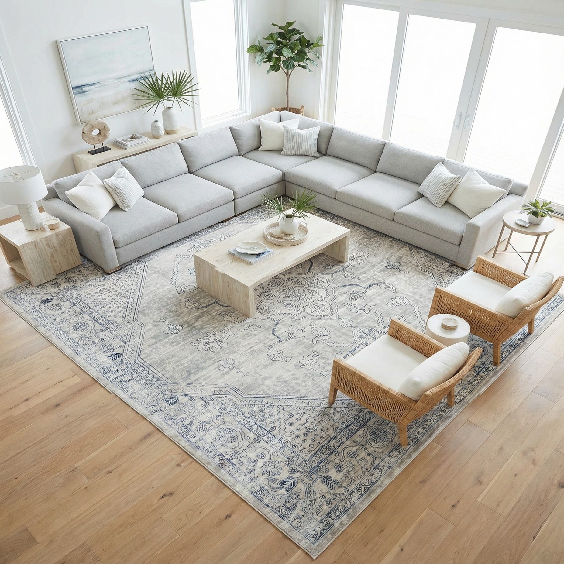 This rug works well as an anchor in living rooms under a coffee table, layered beneath a bed to add quiet texture, or placed in a dining area where a calm, neutral foundation is desired. Its muted gray and ivory palette pairs easily with coastal, transitional, or modern farmhouse interiors, and complements wood tones, light upholstery, and metal accents for a balanced, lived-in look.