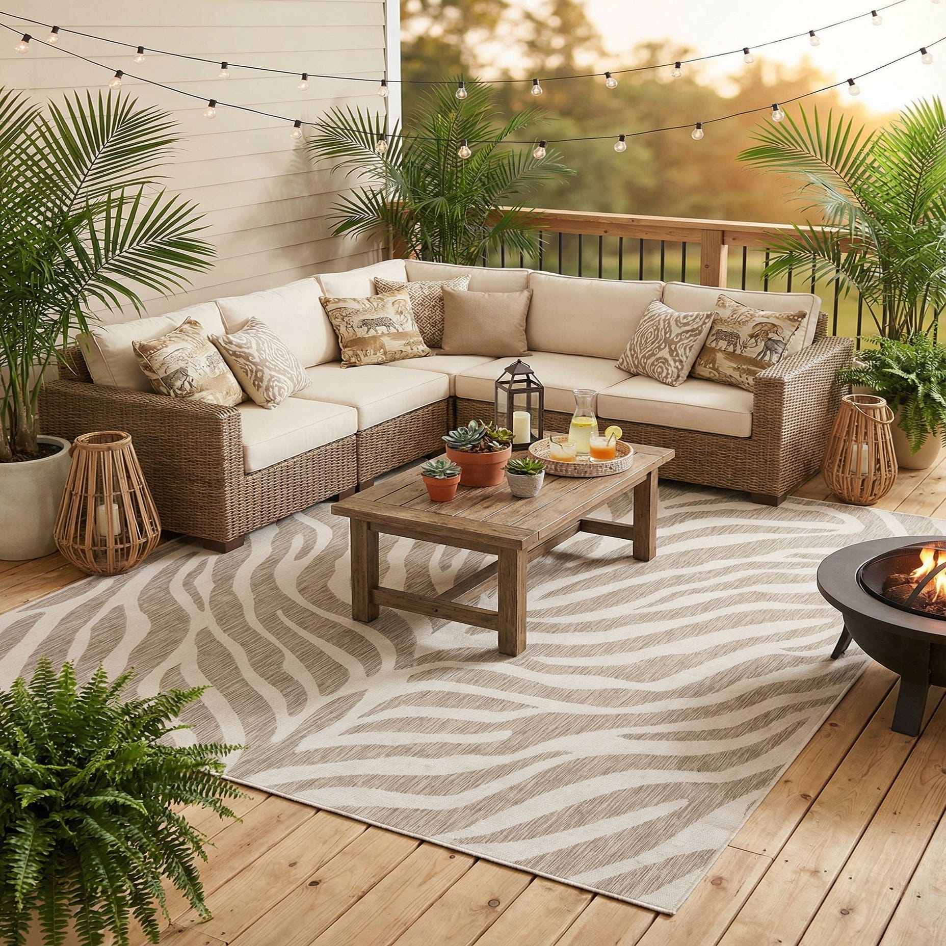 A 10'x10' square gray and silver modern rug with a subtle zebra stripe pattern, suitable for indoor/outdoor use.