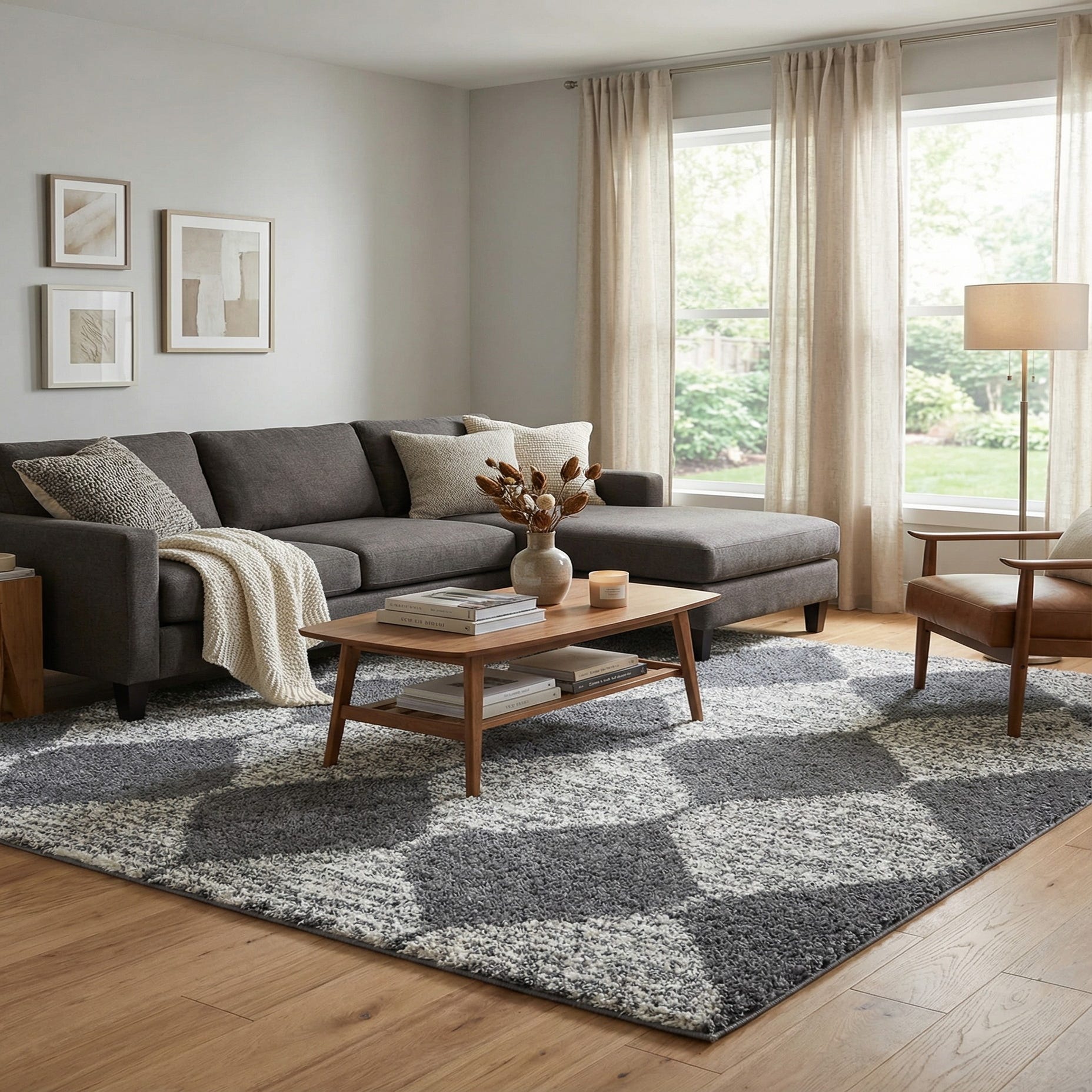 The serene color palette of the Serenity Shag rug allows it to harmonize with a variety of interior scenarios. Its sizable square shape makes it an excellent anchor for a seating arrangement in a living room or underneath a square dining table. This rug could also effortlessly complement a spacious foyer, imbuing it with a welcoming warmth. The textural contrast against hardwood or tiled floors can create an intriguing visual and tactile interplay.