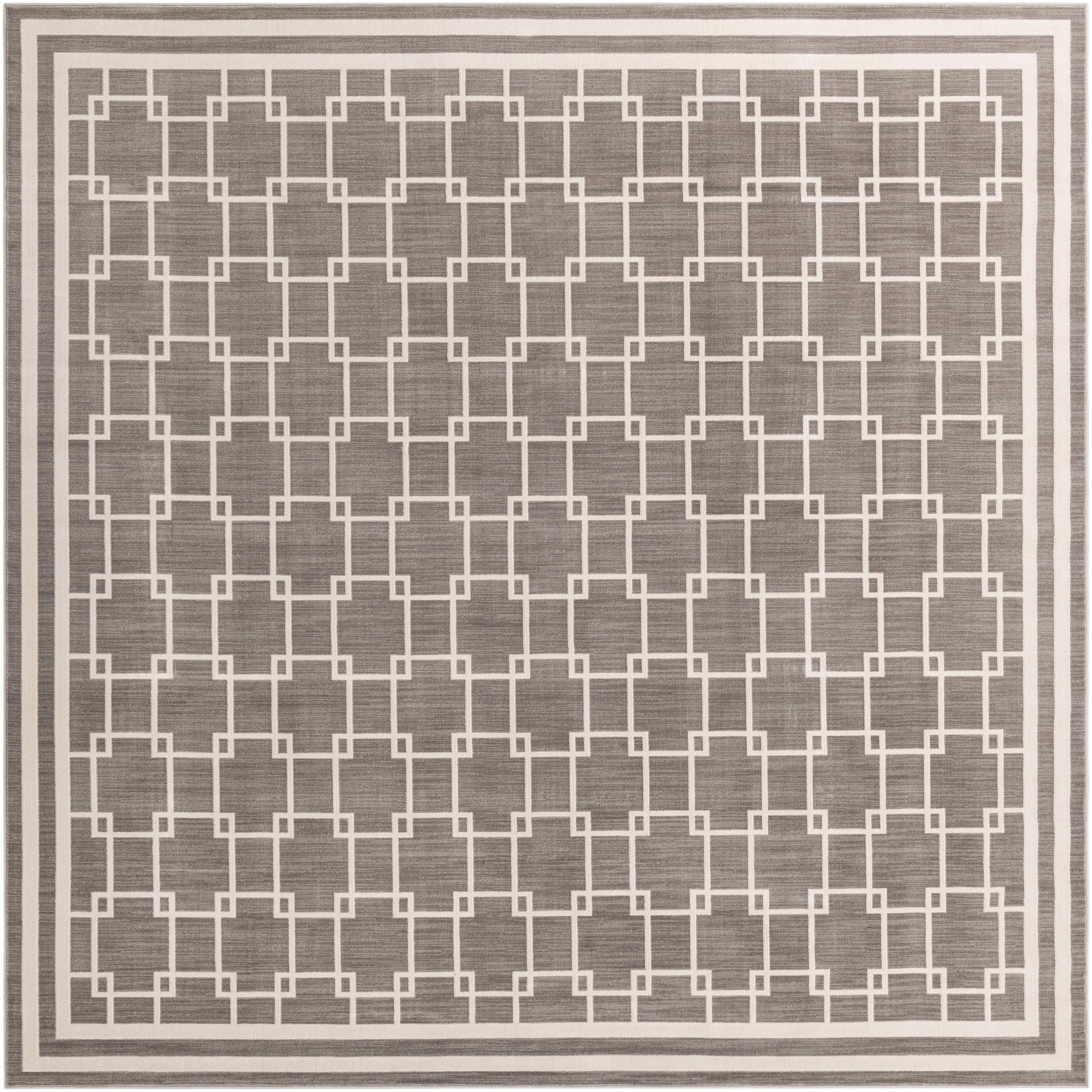 A 10'x10' square gray modern area rug with a repeating white geometric square pattern and a triple-line border.