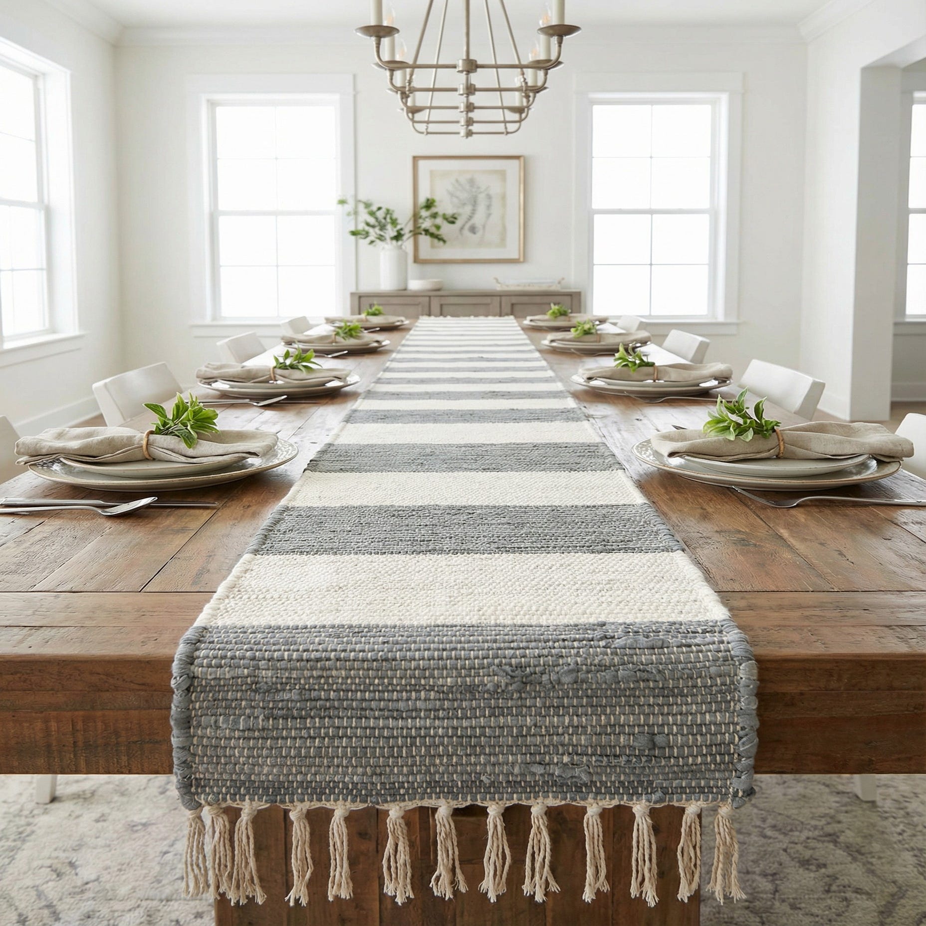 Use it down the center of a dining table or across a kitchen island to introduce pattern without overwhelming a room. It complements natural wood and painted tabletops, simple ceramic dinnerware, and linen accents—suiting modern farmhouse, Scandinavian, coastal, or transitional interiors—and can also be layered over a solid tablecloth or a longer runner for added depth.