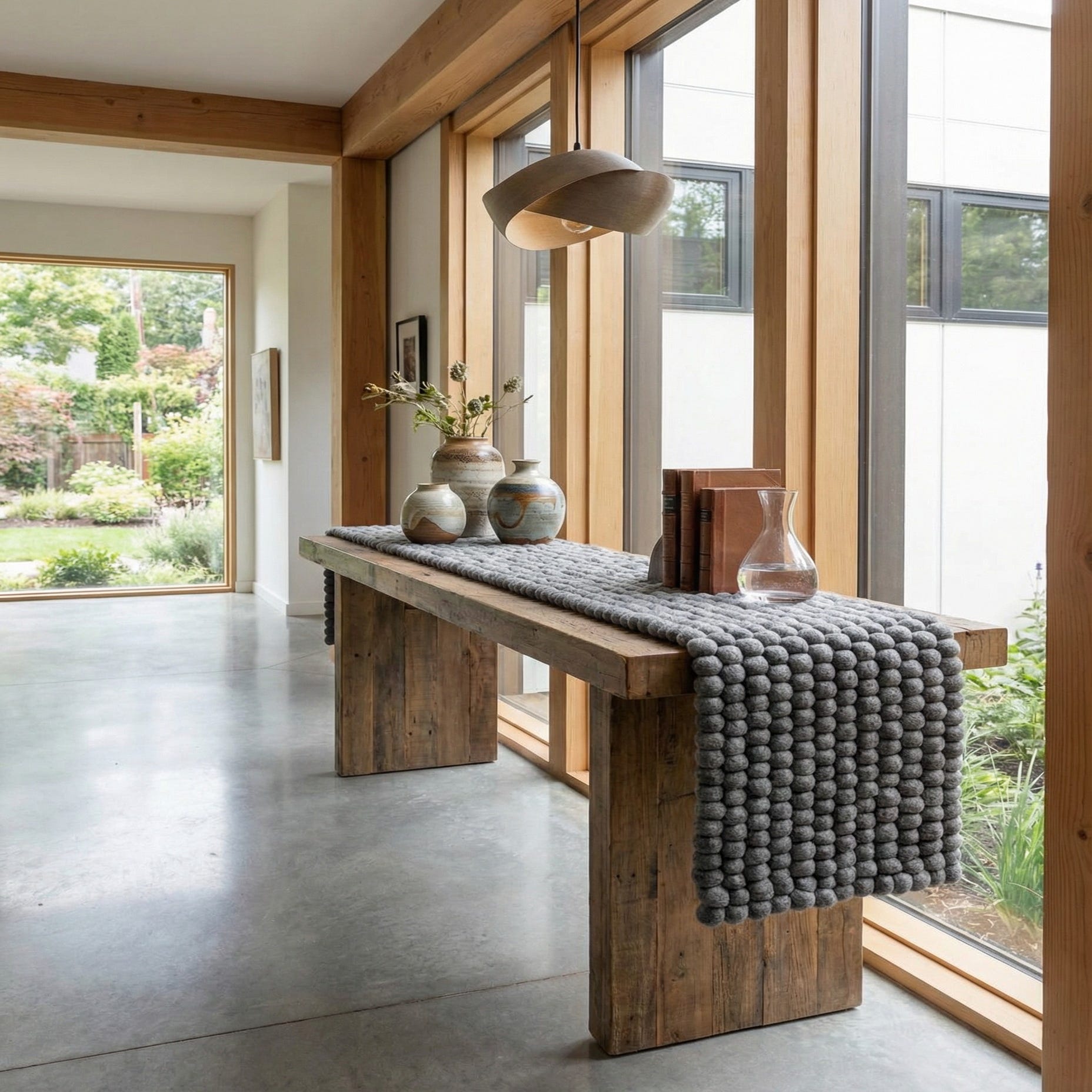 Use it along a dining table to introduce texture against wood or metal, or place it on a narrow console or sideboard to anchor decorative objects and ceramics. It adapts well to contemporary, Scandinavian, minimalist, and rustic-modern interiors and pairs naturally with natural woods, black metal accents, and neutral linens to create a collected, tactile table composition.