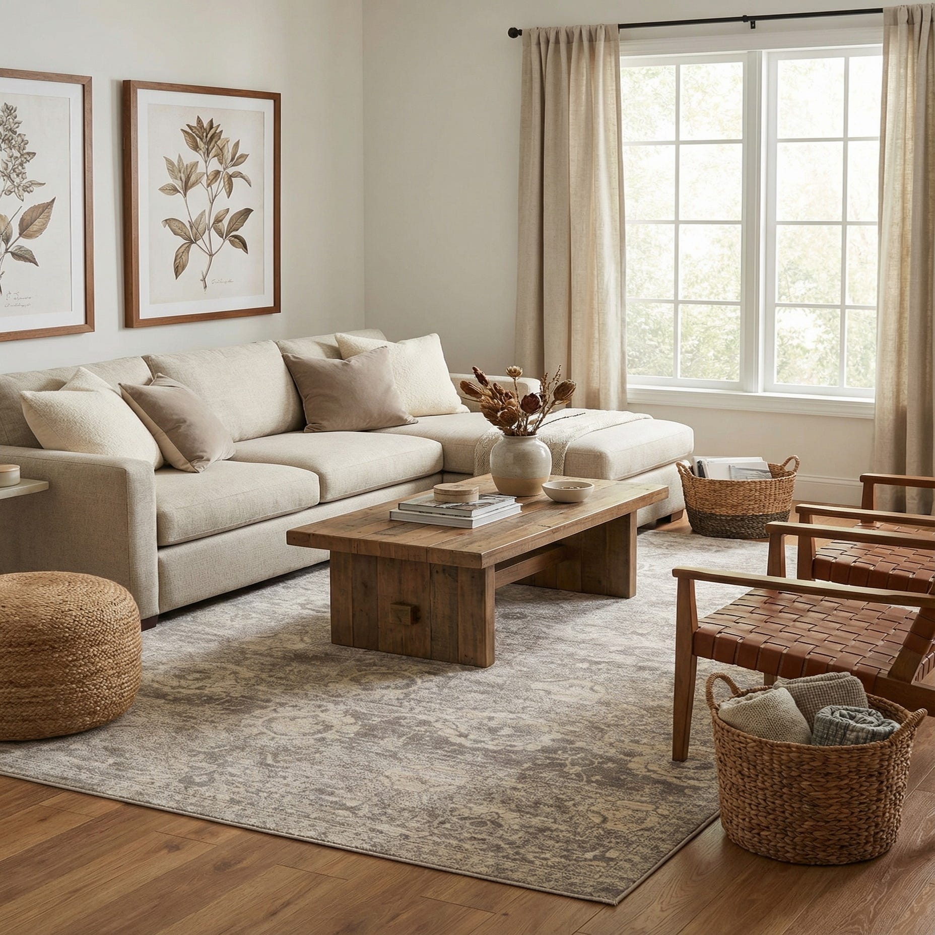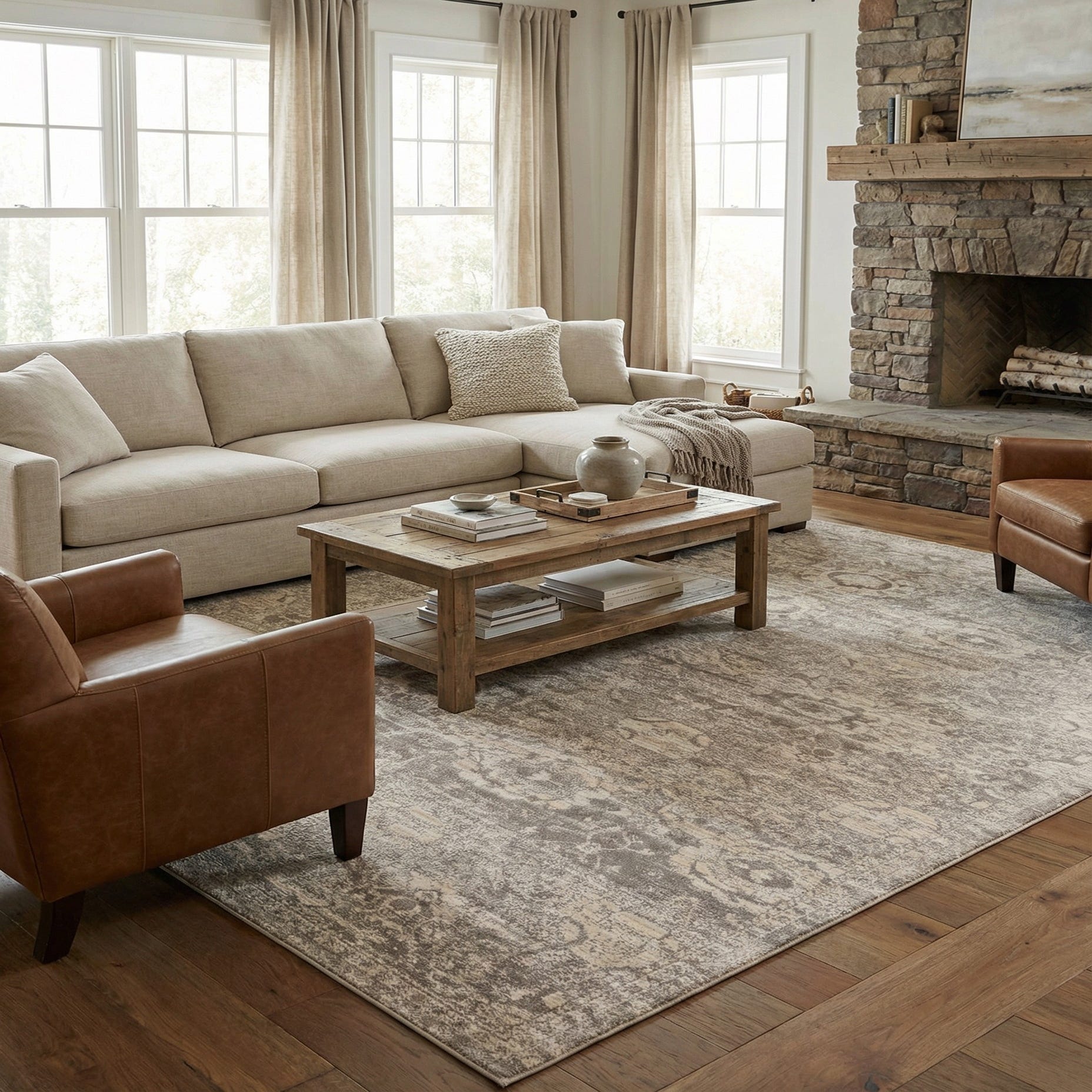 The rug complements a range of interiors—place it beneath a living room seating group to anchor the space, layer it under a bed to add quiet pattern to a bedroom, or use it in a dining area to balance a wood or glass table. Its neutral gray-and-ivory palette works with transitional, contemporary, Scandinavian, and modern farmhouse schemes, and pairs well with both warm wood tones and cool metal finishes for a calm, collected foundation.