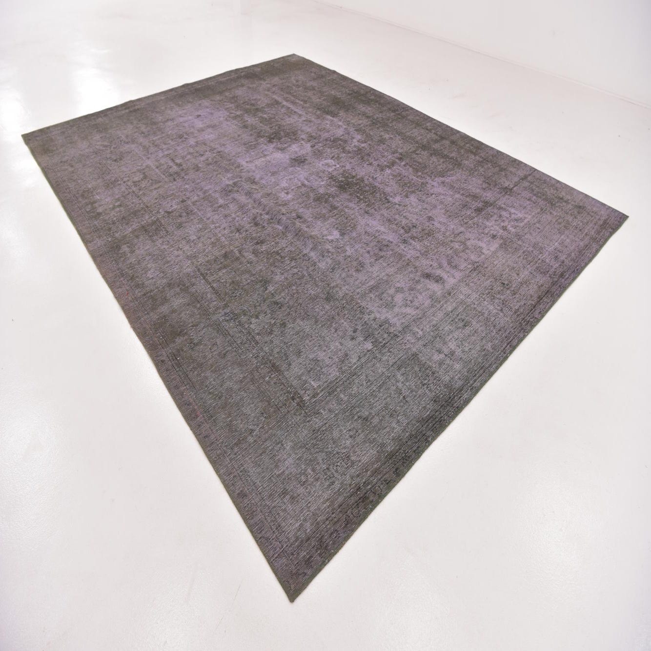 This Ultra Vintage collection rug is a hand-knotted piece measuring 10x12, constructed from 100% wool. It offers a nuanced visual texture, with a predominant gray background accented by subtle violet undertones. The rug's pattern is reminiscent of traditional designs, but the faded and almost erased motif gives it a timeless, distressed appearance that transcends specific styles.