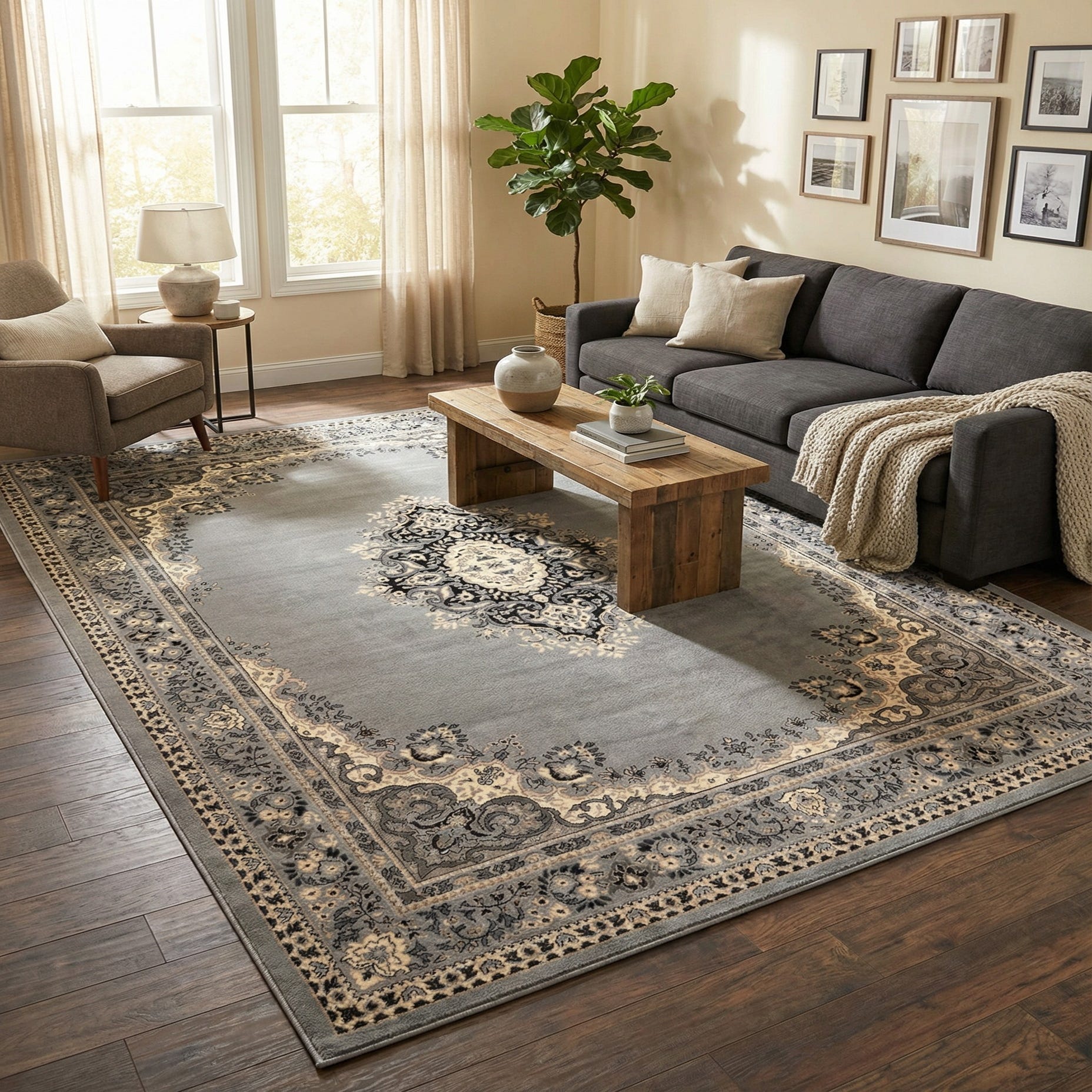 This rug suits transitional and traditional interiors as well as contemporary spaces that favor anchored, neutral palettes. Use it to ground a seating area beneath a sofa and coffee table, beneath a dining table to add formal structure, or to layer at the foot of a bed for a polished bedroom look. It pairs naturally with cream or beige linens, black or matte metal accents, and warm wood floors for a composed, cohesive room.