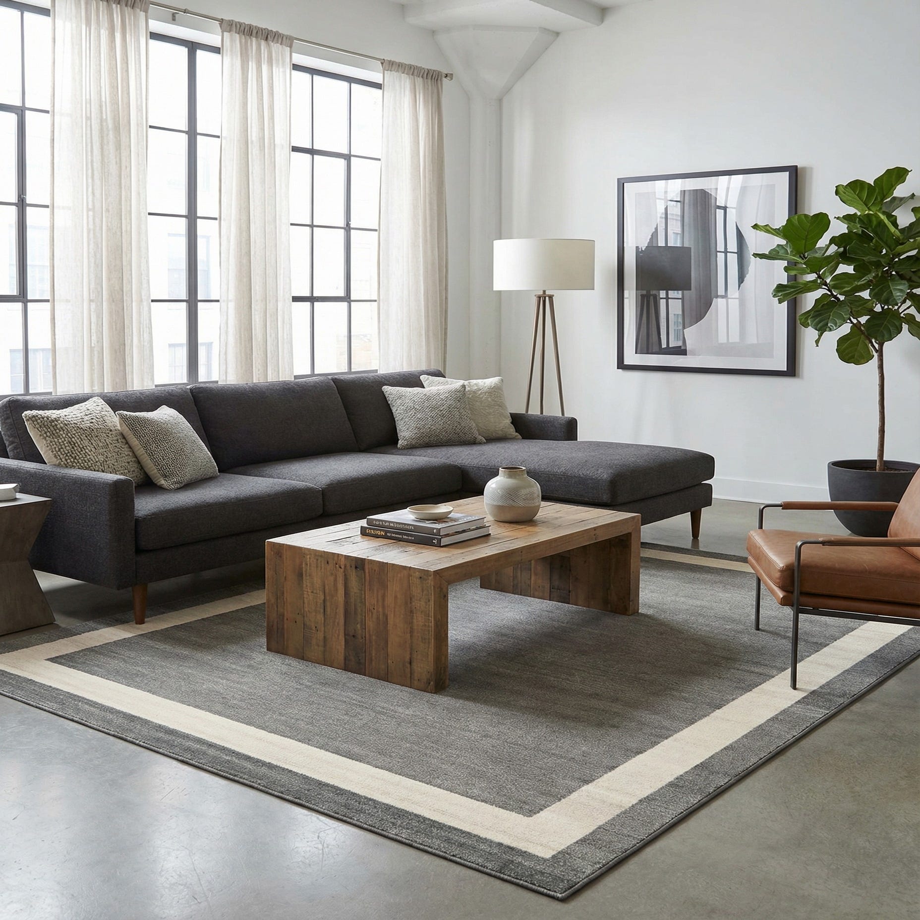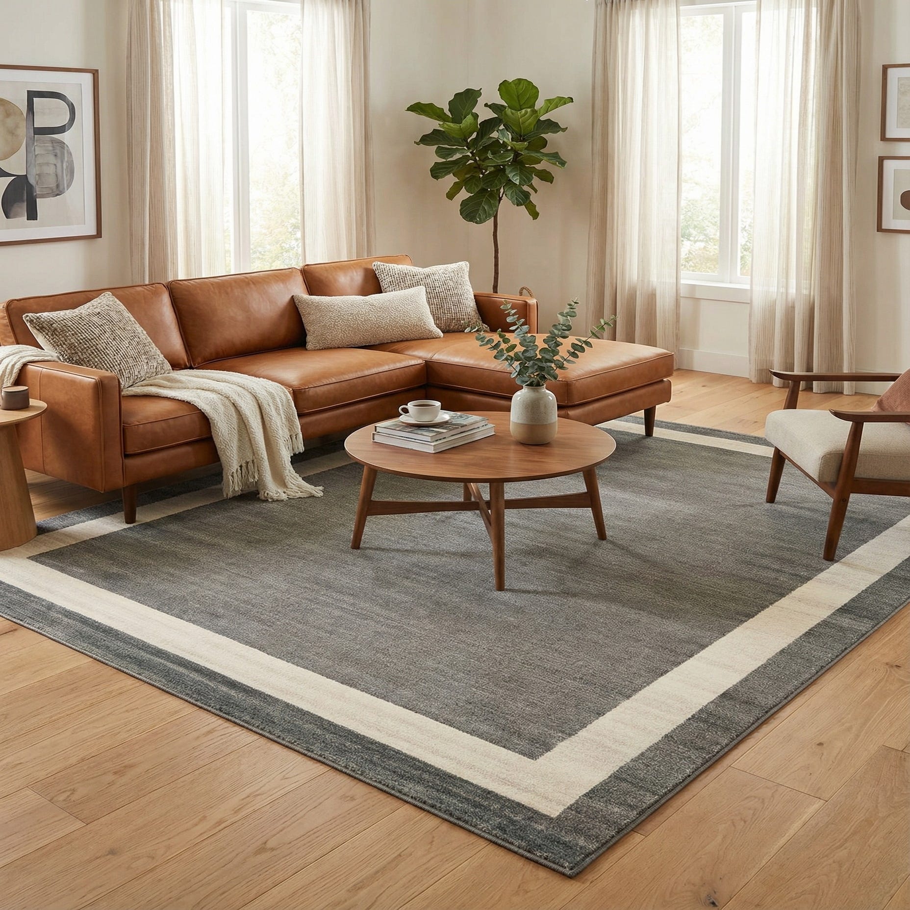 A 10x13 rectangular gray area rug with a subtle cream border, suitable for a modern living room.