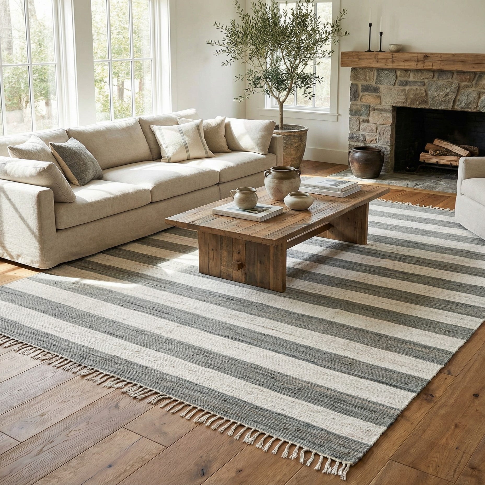 The neutral gray and ivory palette makes this rug versatile for a range of interiors—from Scandinavian and modern farmhouse to coastal and relaxed contemporary rooms. Place it beneath a low coffee table to anchor a seating area, under a dining table to define a dining space, or in an entryway to introduce a calm, textural element. Pair it with natural wood furniture, linen upholstery, woven baskets, and matte metal accents for a cohesive, layered look.