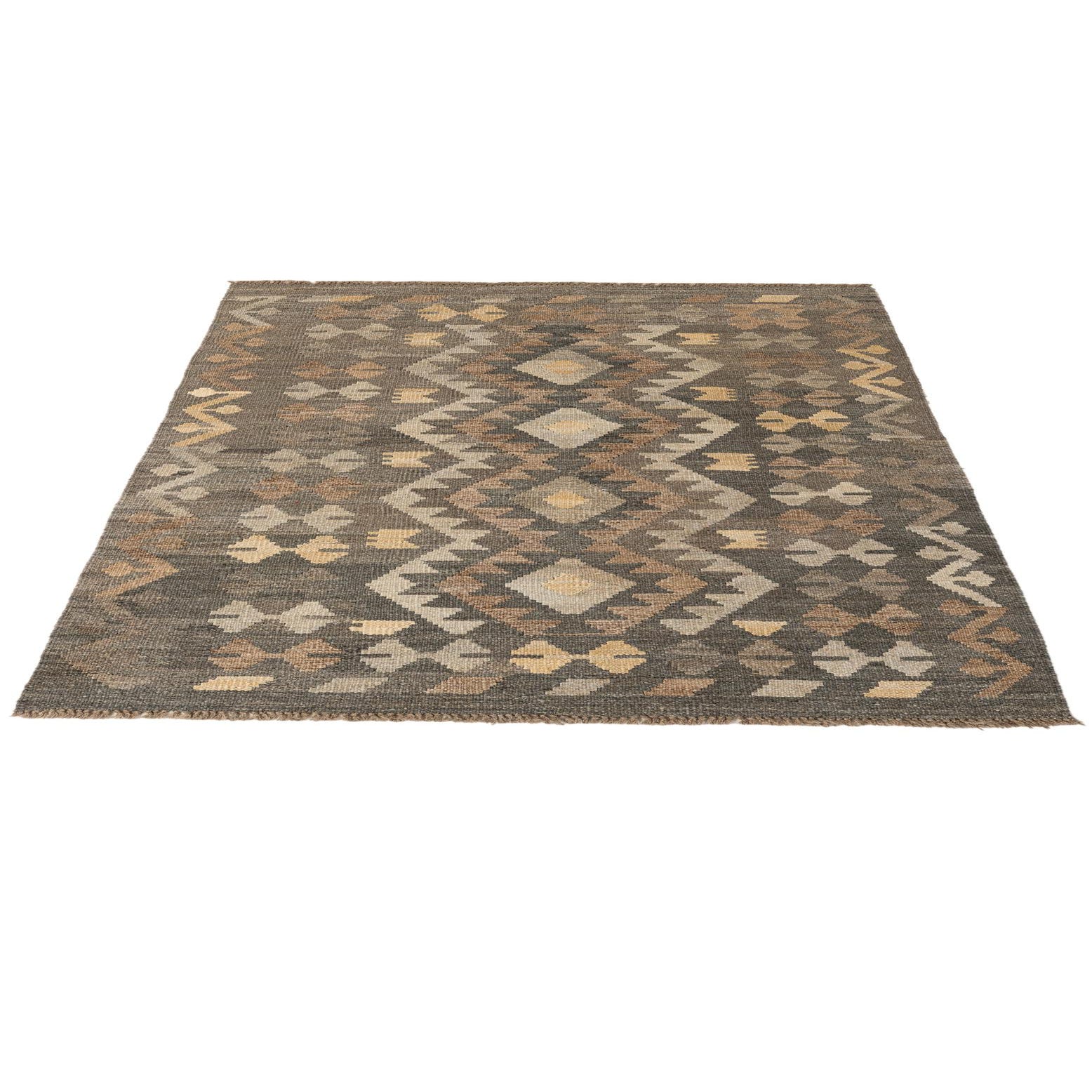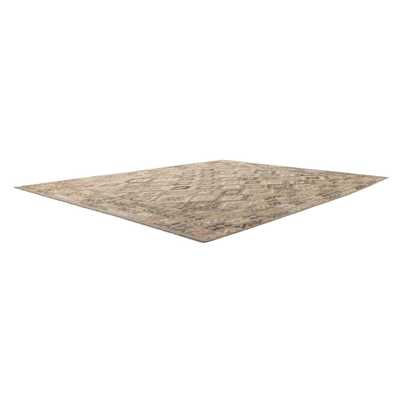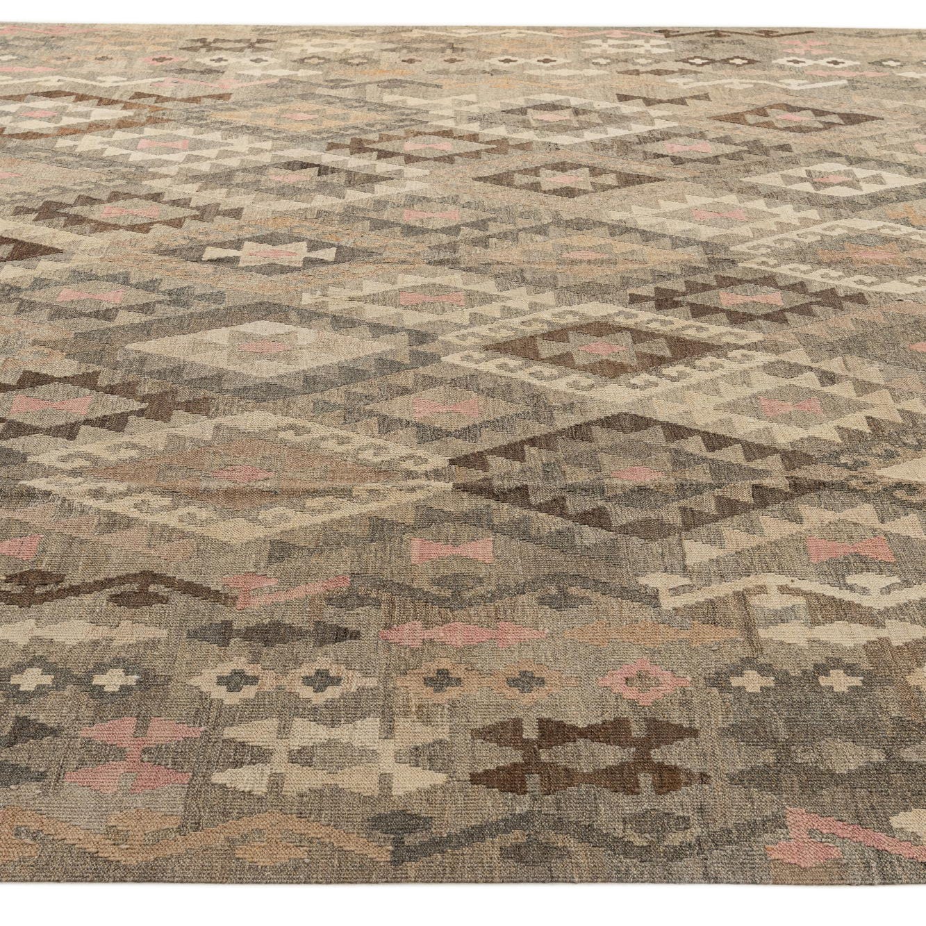 A 10x13 rectangular gray tribal flatweave rug with a modern geometric diamond pattern in varying shades of gray, brown, and pink.