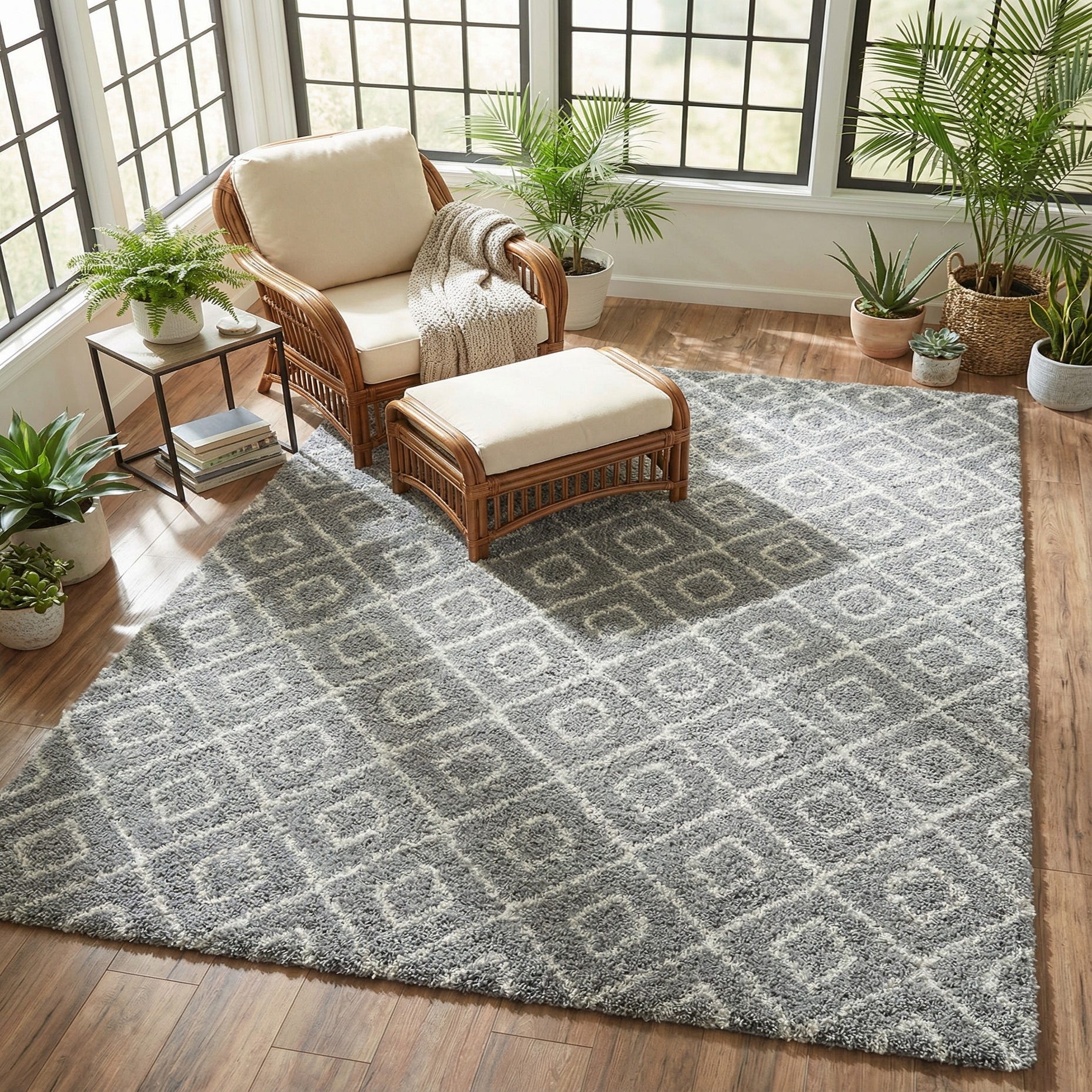 A plush, high-pile shag in a cool mid-gray provides a soft, cushioned foundation while an ivory geometric lattice adds crisp, graphic interest. The pattern is a repeating diamond-within-diamond motif created through a subtle pile variation, so the ivory lines lift slightly from the gray field and create gentle depth and texture as you run your hand across it. Machine-made from 100% polypropylene, the construction keeps the surface feeling dense and cozy without losing the clarity of the design.
