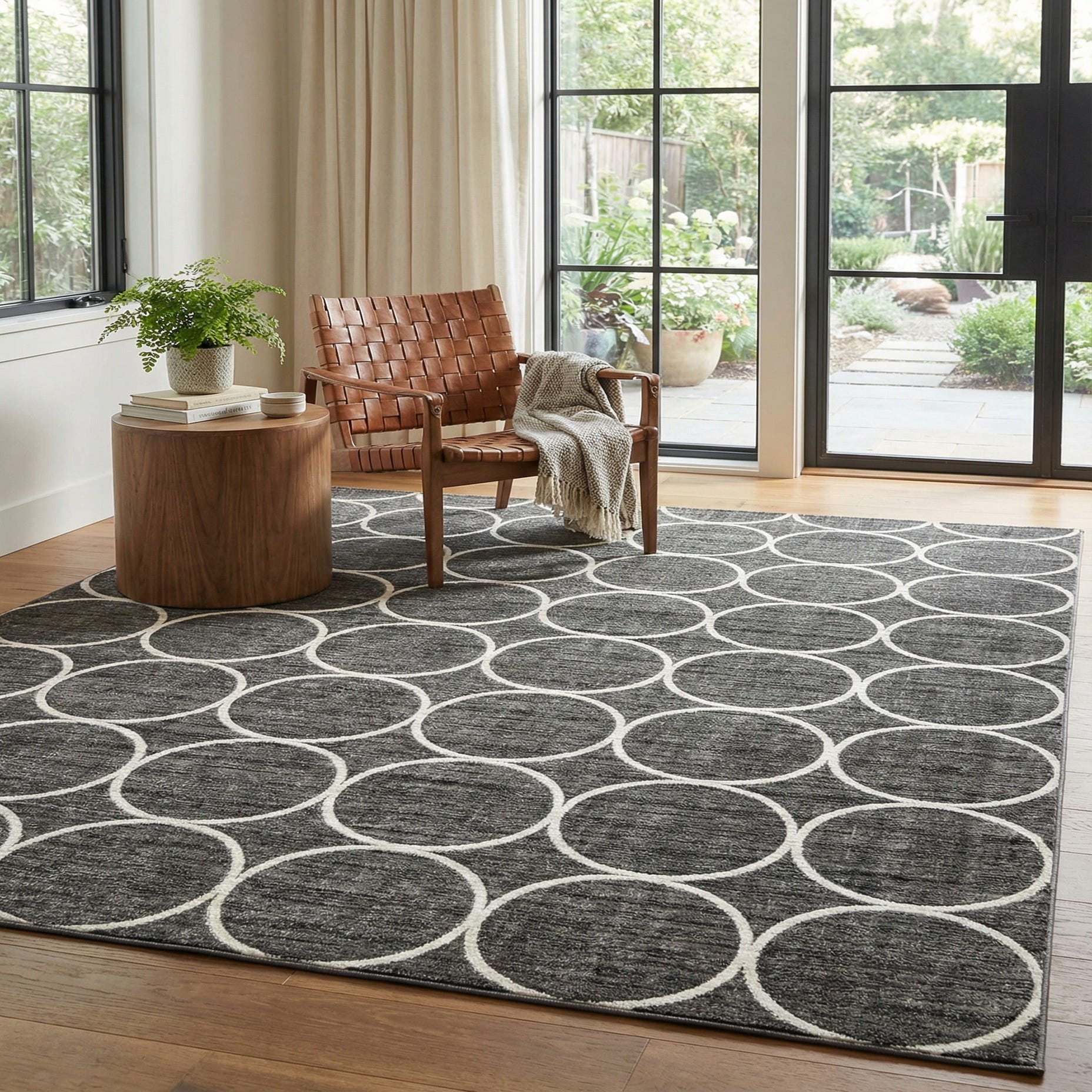 A bold geometric trellis of oversized ivory circles rests against a deep gray ground, creating a clean, rhythmic pattern that reads modern and structured. The large-scale motif is precisely defined, the ivory rings contrasting crisply with the textured gray background. Machine-made from 100% polyester, the surface has a low, dense pile with a soft hand and a subtle sheen that catches light and highlights the woven texture beneath the pattern.