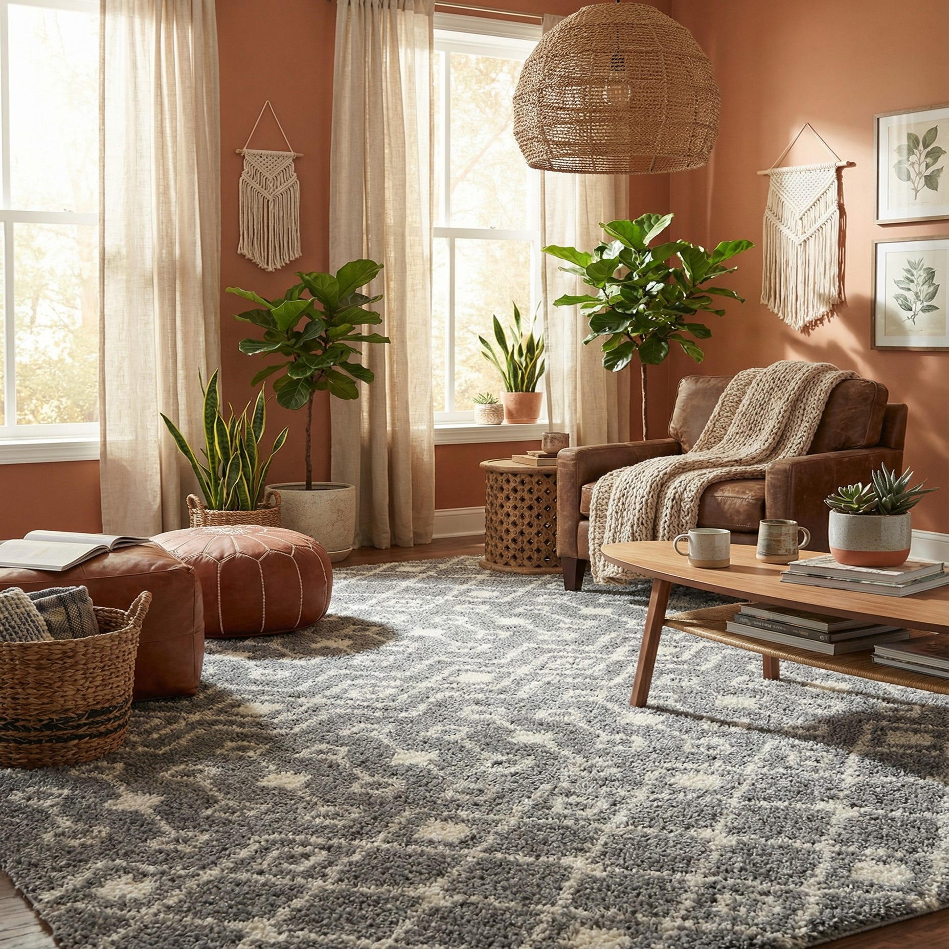 Place this rug under a living room seating group to anchor a sofa and coffee table, layer it at the foot of a bed for added softness, or use it in a cozy reading corner to warm up hardwood or tile floors. The gray-and-ivory pattern pairs seamlessly with transitional and contemporary interiors as well as modern farmhouse or Scandinavian schemes; combine it with light woods, linen upholstery, and matte metal accents for a balanced, comfortable look.