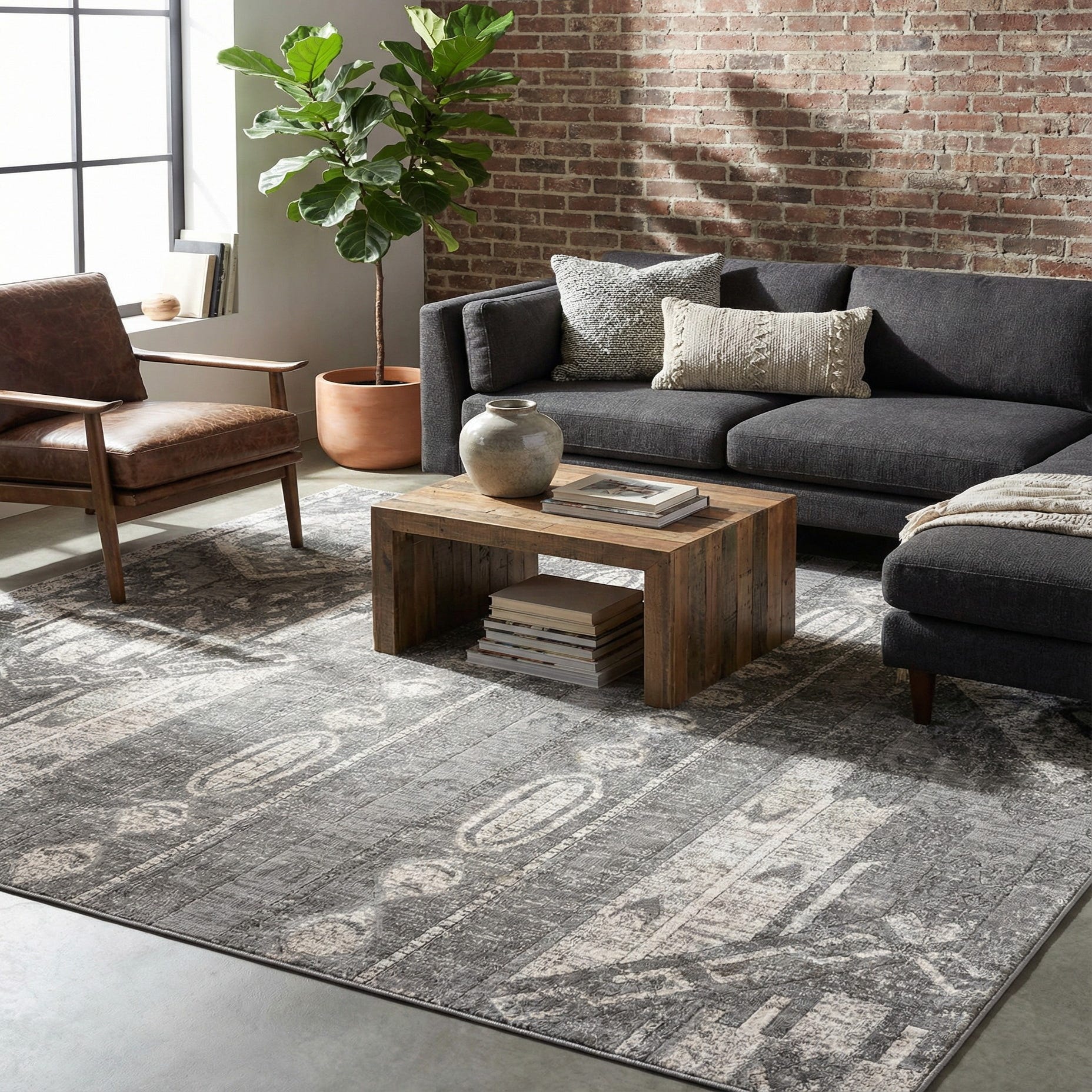 This rug works well where you want to establish a quiet, layered backdrop—anchoring a seating area in a living room, defining an open-plan family room, or running beneath a dining set. It pairs naturally with warm wood tones and cream upholstery for a transitional or modern farmhouse look, and also complements metal and concrete finishes in an industrial or contemporary scheme. Use it to add pattern without overwhelming a space or to soften harder surfaces like hardwood or tile.