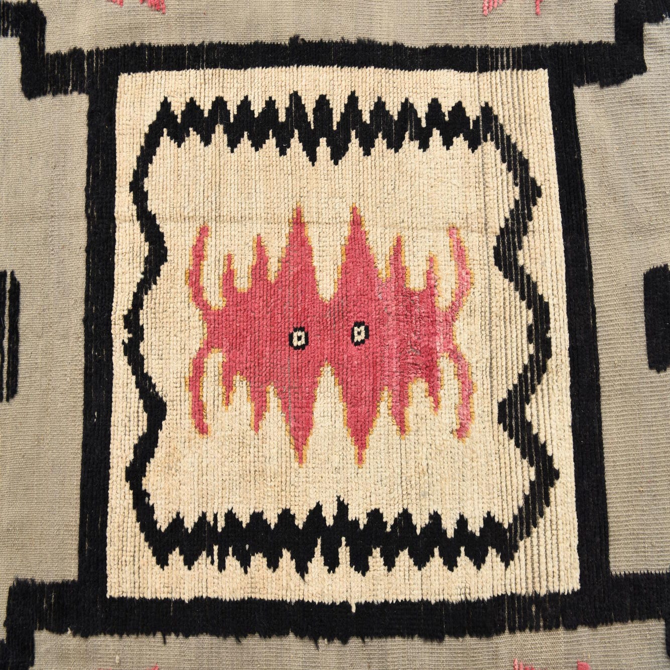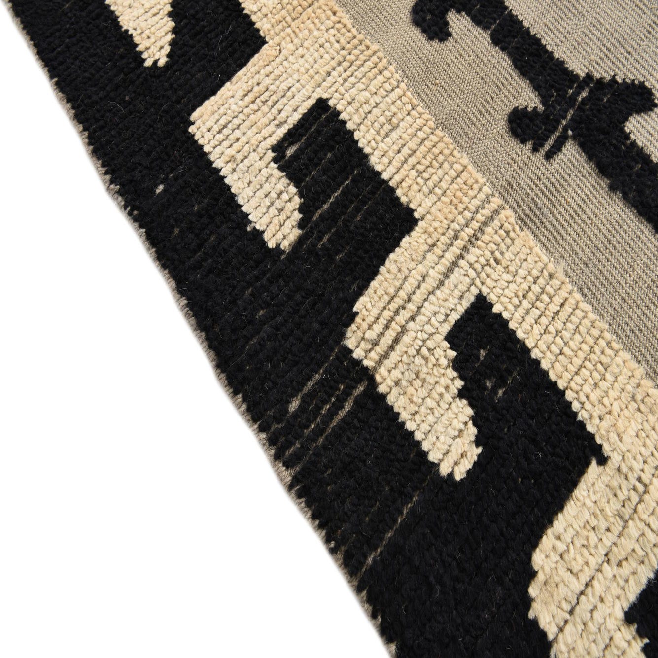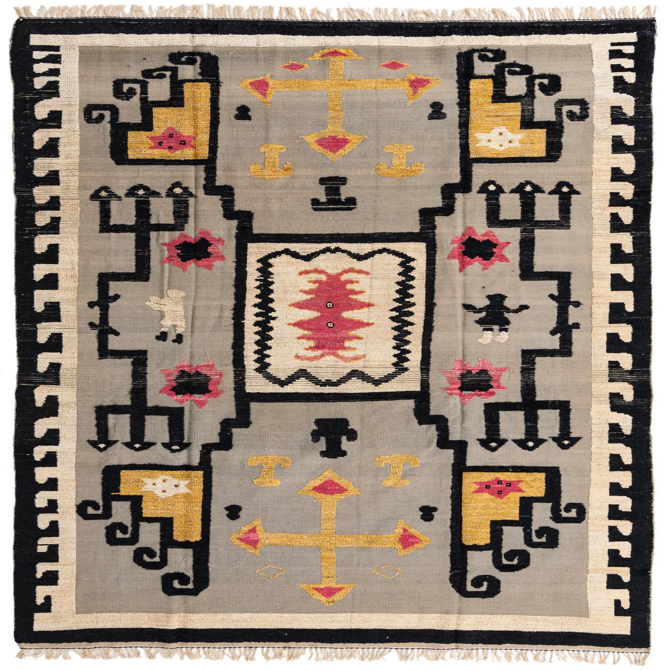 A 10x13 rectangular gray wool rug with a modern abstract pattern in black, gold, and pink, featuring geometric shapes and stylized figures.