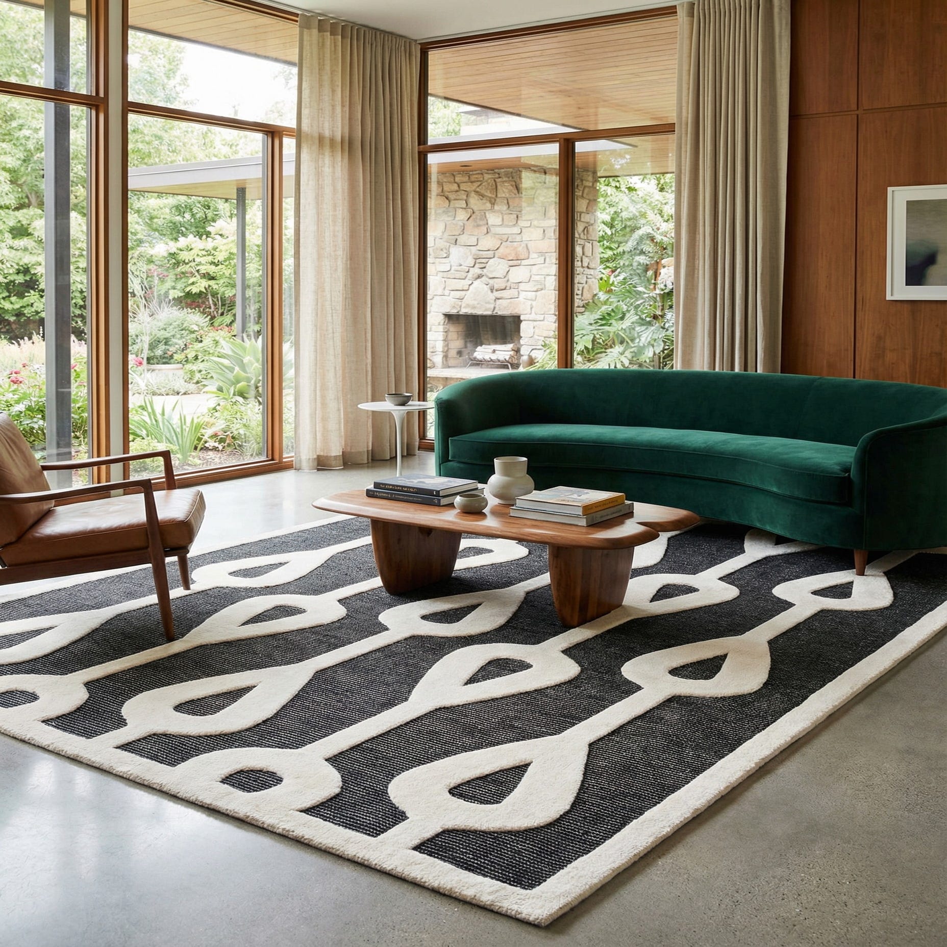 A 10x13 rectangular gray modern area rug with a bold, repeating white geometric chain link pattern.