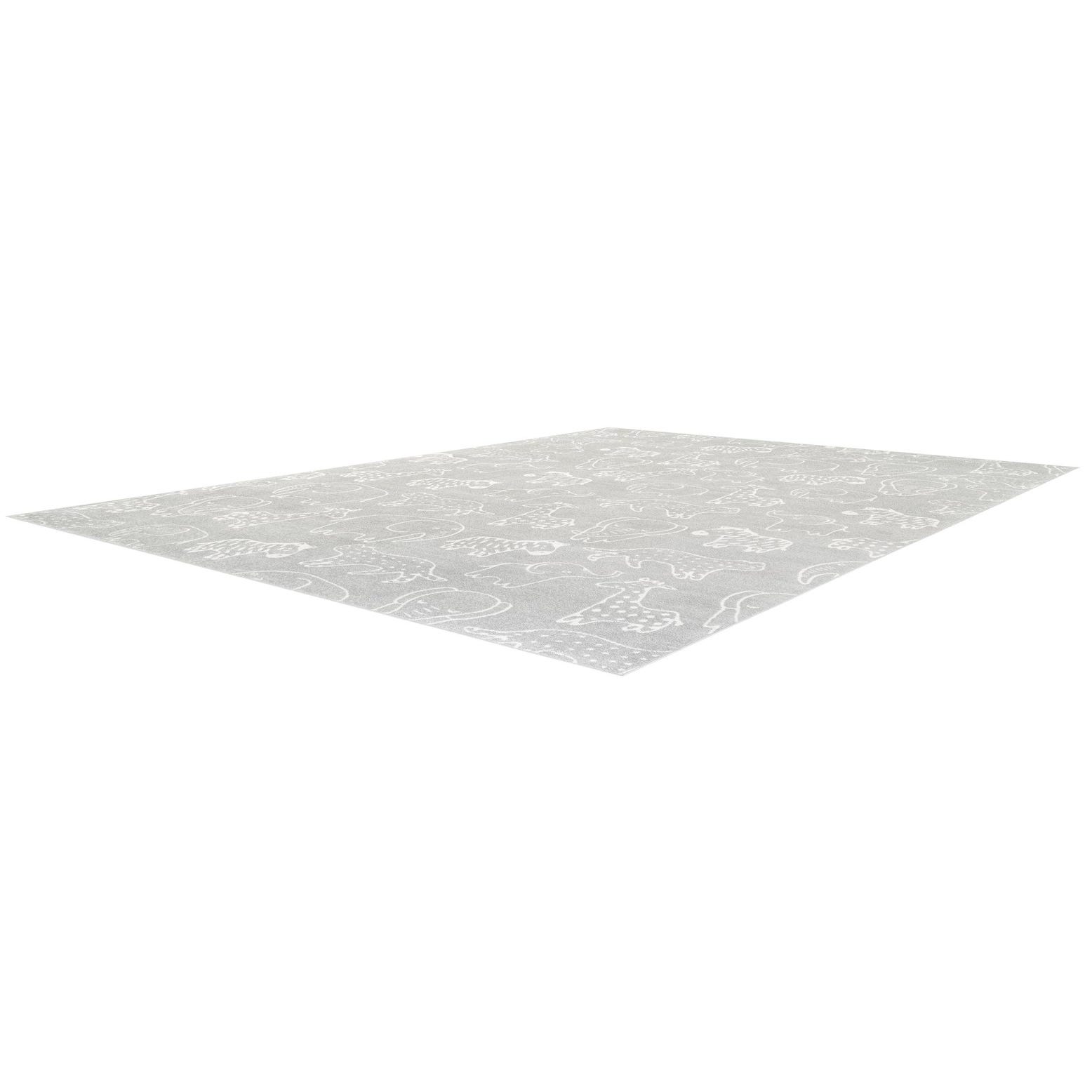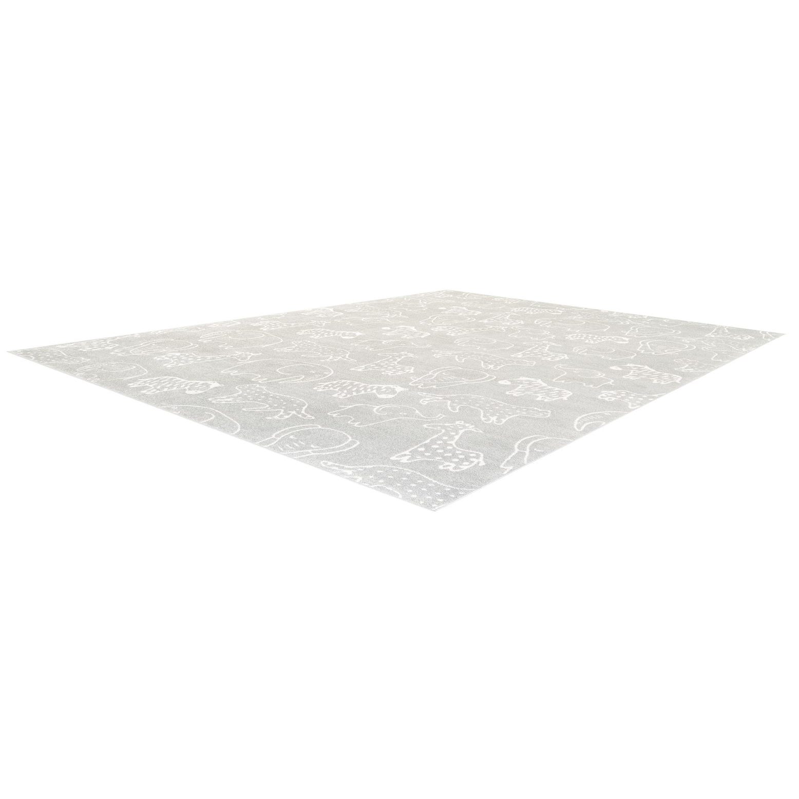 A soft gray field provides a neutral backdrop for a whimsical repeat of hand-drawn animal outlines in ivory. The playful motif—elephants, giraffes, zebras and other friendly shapes—reads as casual and contemporary, with clean linework that adds visual interest without overwhelming a space. Machine made from 100% polypropylene, the rug has a low-to-medium pile with a smooth, slightly velvety hand that feels comfortable underfoot while maintaining a neat, structured appearance.