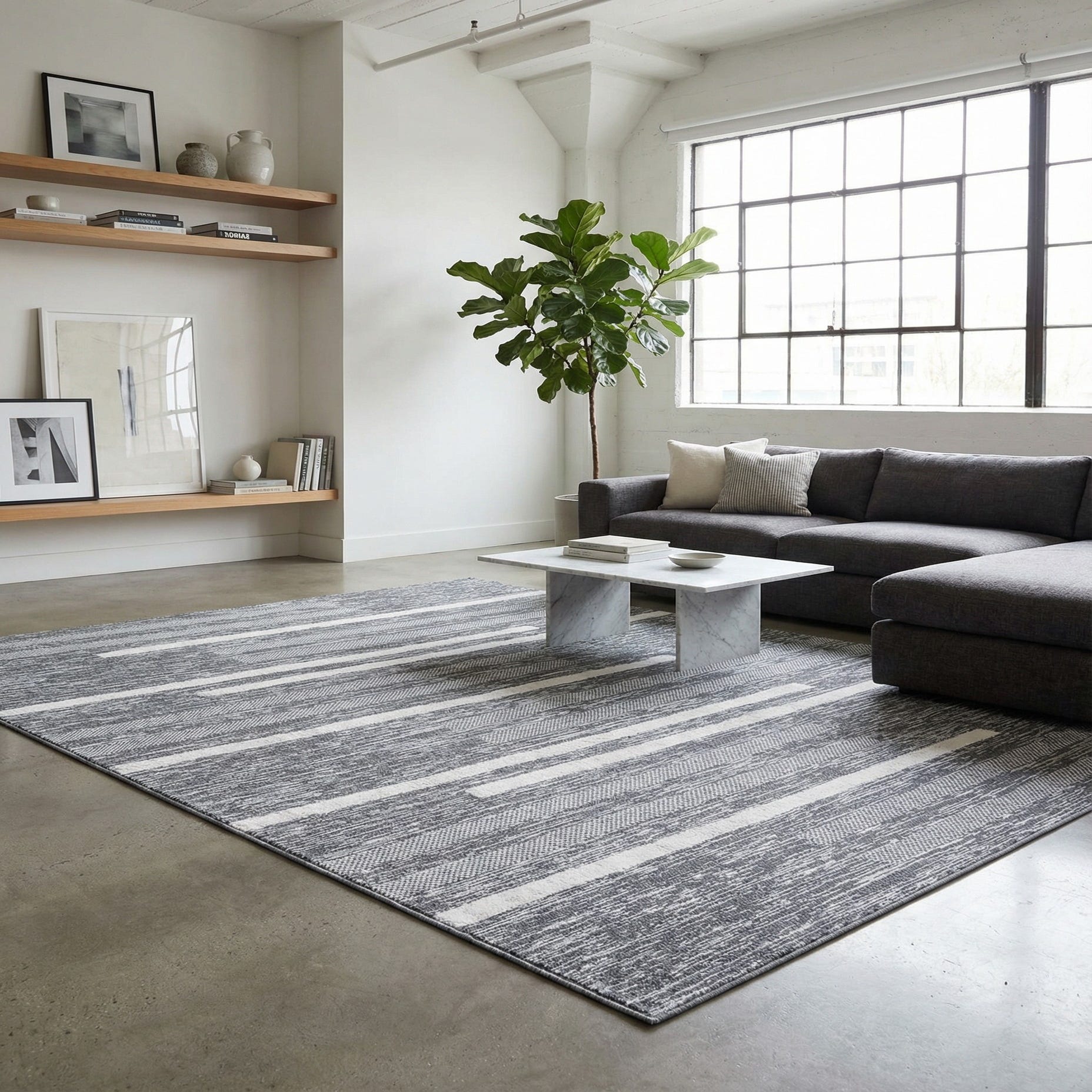A 10x14 rectangular gray and silver contemporary rug with a textured stripe pattern, featuring high and low pile.