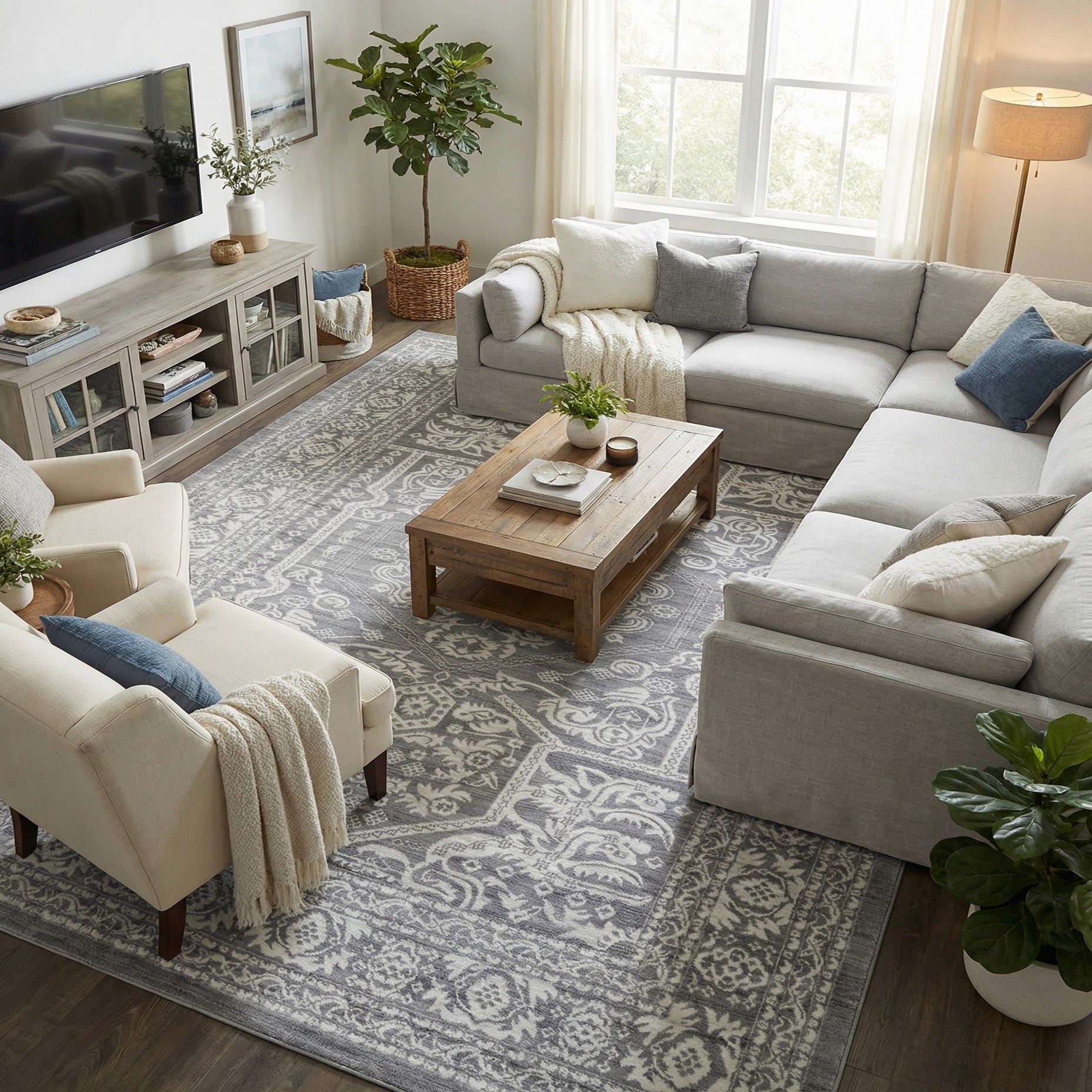 Machine made from 55% polypropylene and 45% polyester, the rug has a low-profile, smooth texture that lies flat beneath furniture and offers a soft hand underfoot. The fiber blend provides a subtle sheen that highlights the carved-looking motifs and keeps the surface easy to position in living areas. Use this rug to ground a sofa grouping in a living room, anchor a dining table, or layer beneath a bed to add understated pattern to a bedroom. It complements transitional, modern farmhouse, and contemporary-classic interiors, pairing well with light woods, neutral upholstery, and mixed-metal accents.