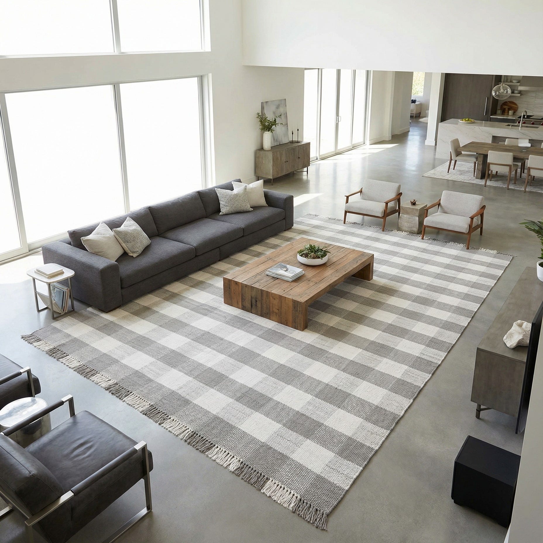 This piece fits clean-lined and casual interiors alike — layer it under a neutral sofa and light wood coffee table for modern farmhouse or Scandinavian settings, or place it in a sunroom, covered patio, or kitchen to ground seating and dining areas without overwhelming the room. Its gray background and ivory checks work well with woven rattan, leather accents, and soft linen textiles for an inviting, lived-in look.