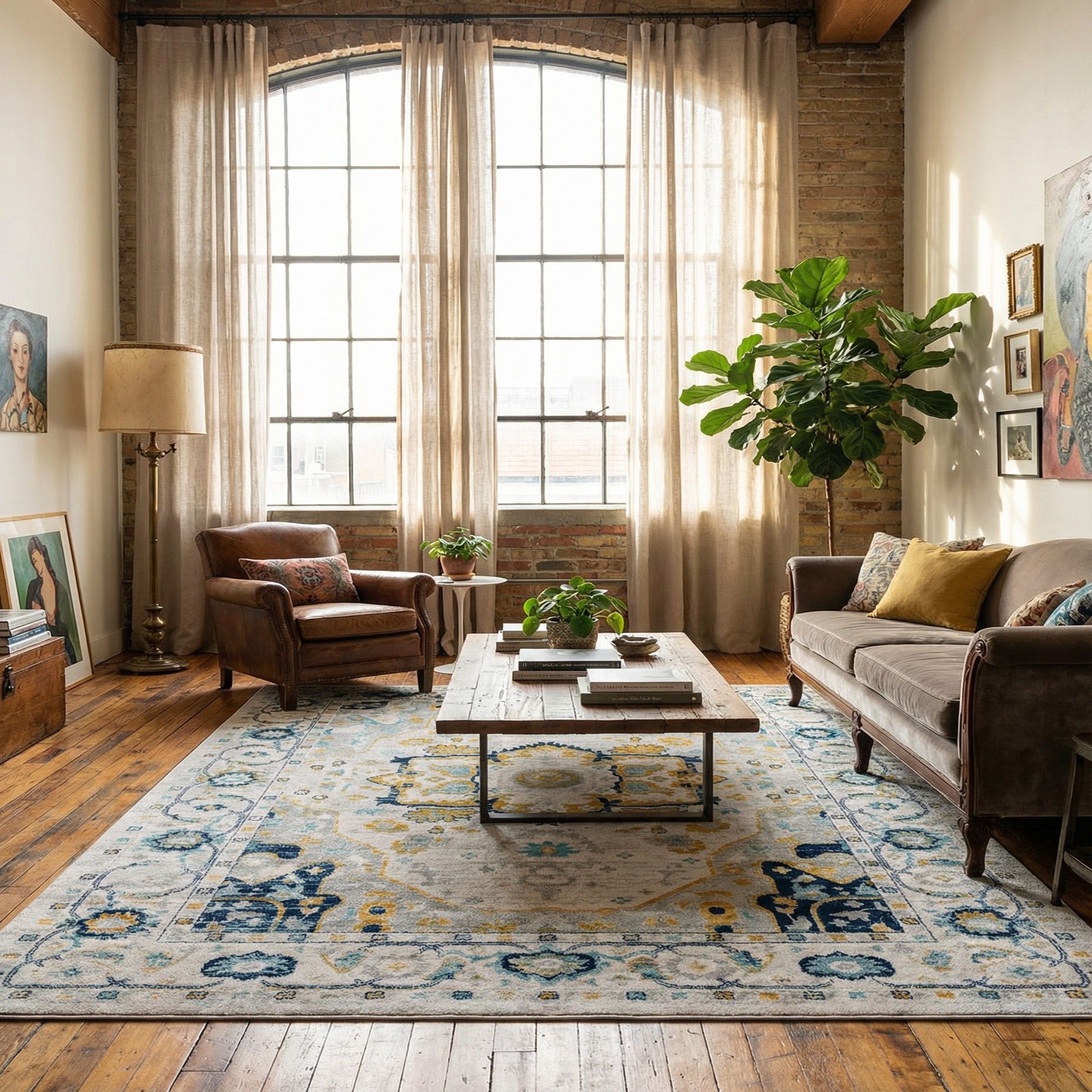 This rug would fit seamlessly into interiors that draw on both classic and modern elements, such as transitional spaces, chic urban lofts, or relaxed coastal retreats. It can serve as a subtle anchor in a room with muted tones or as a complement to bolder decor featuring similar hues found within the rug's color scheme.