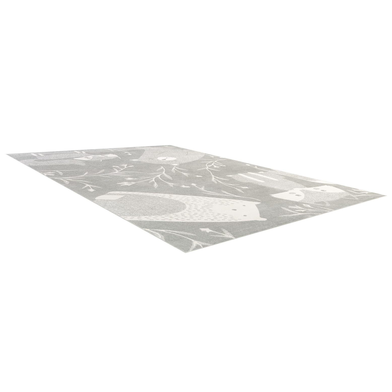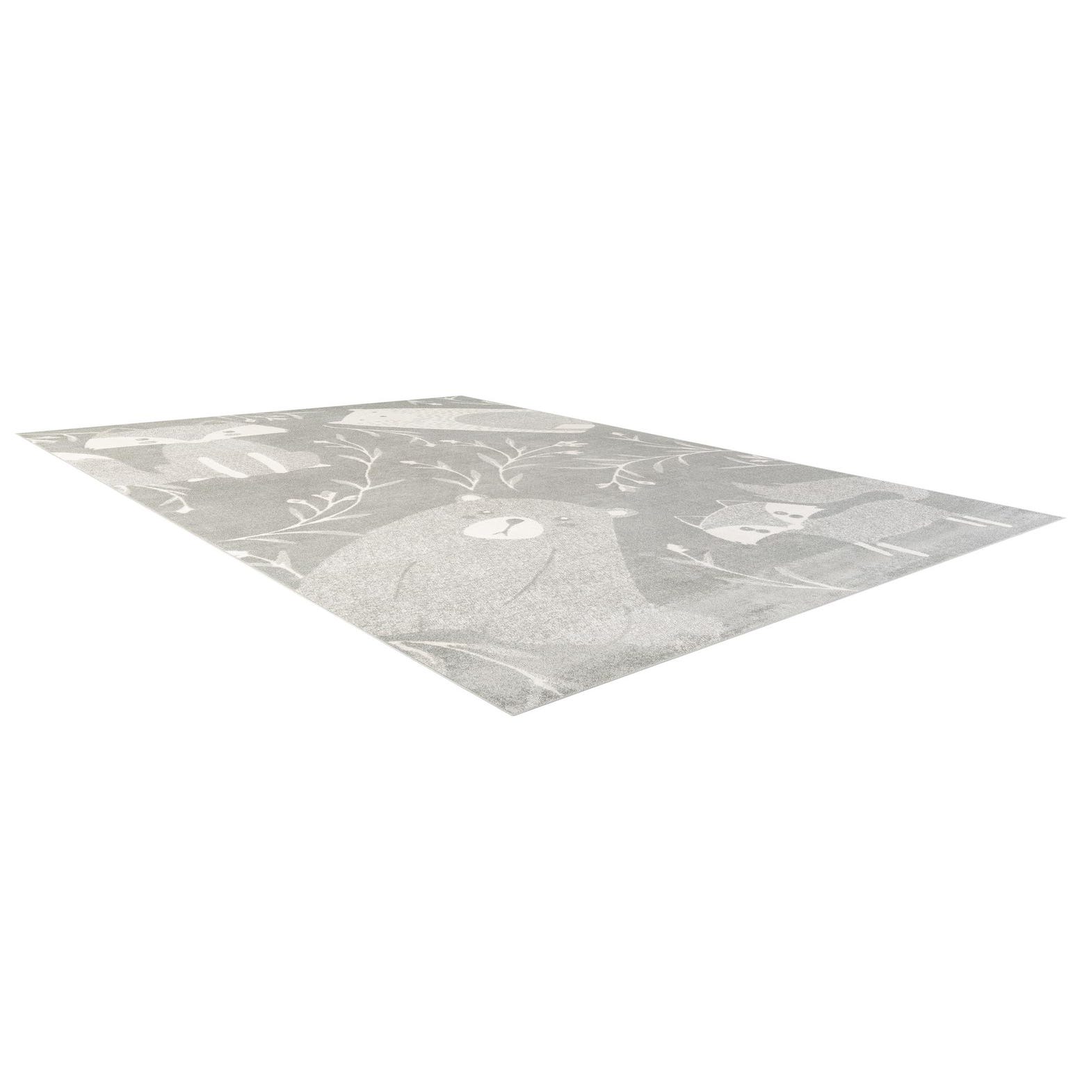 A soft gray field forms the backdrop for a playful woodland motif rendered in ivory — stylized foxes, bears and gentle botanical sprigs create a calm, storybook pattern that feels at once modern and child-friendly. The machine-made construction in 100% polypropylene gives the surface a low, even pile with a smooth hand and subtle tonal variation, so the animal silhouettes and fine branch details read clearly without heavy texture. The neutral gray and ivory palette keeps the look understated while the pattern adds personality.